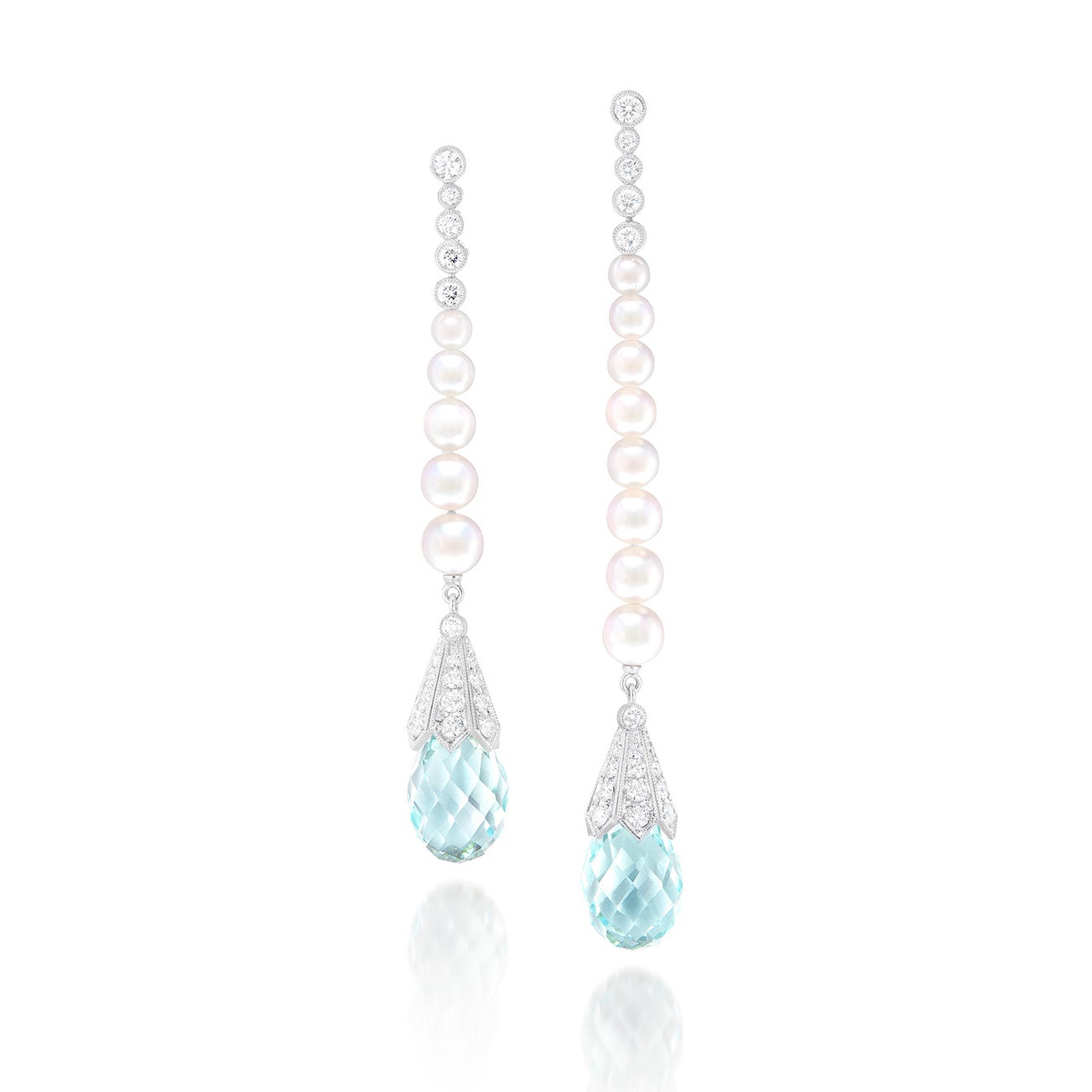 A Pair of Aquamarine, Cultured Pearl and Diamond Earrings