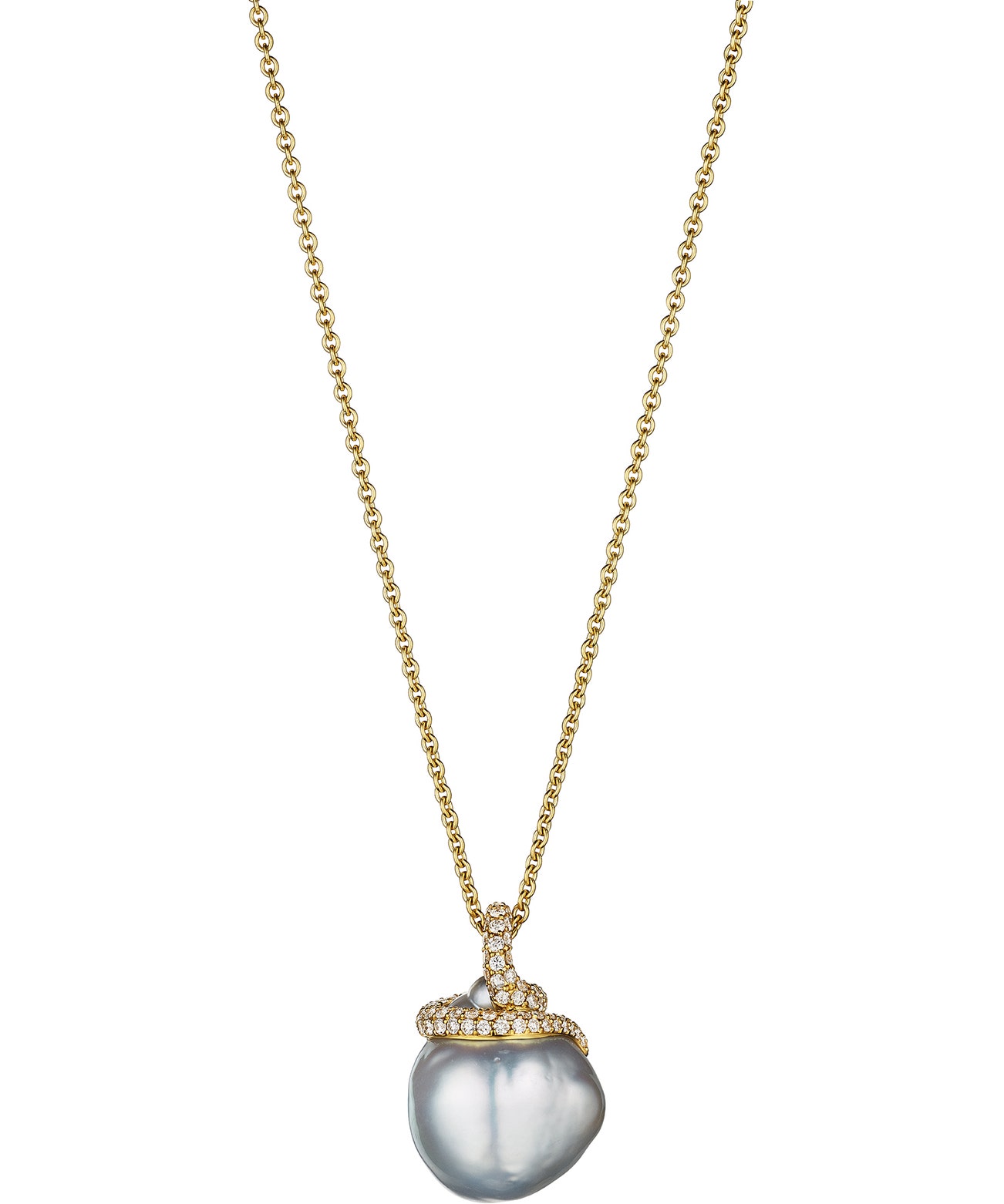 Composed of a cultured Baroque pearl measuring approximately 20.0 x 17.2 mm, suspended by a brilliant-cut diamond bail, mounted in 18K yellow gold, chain length measuring approximately 32 inches, with maker's mark.