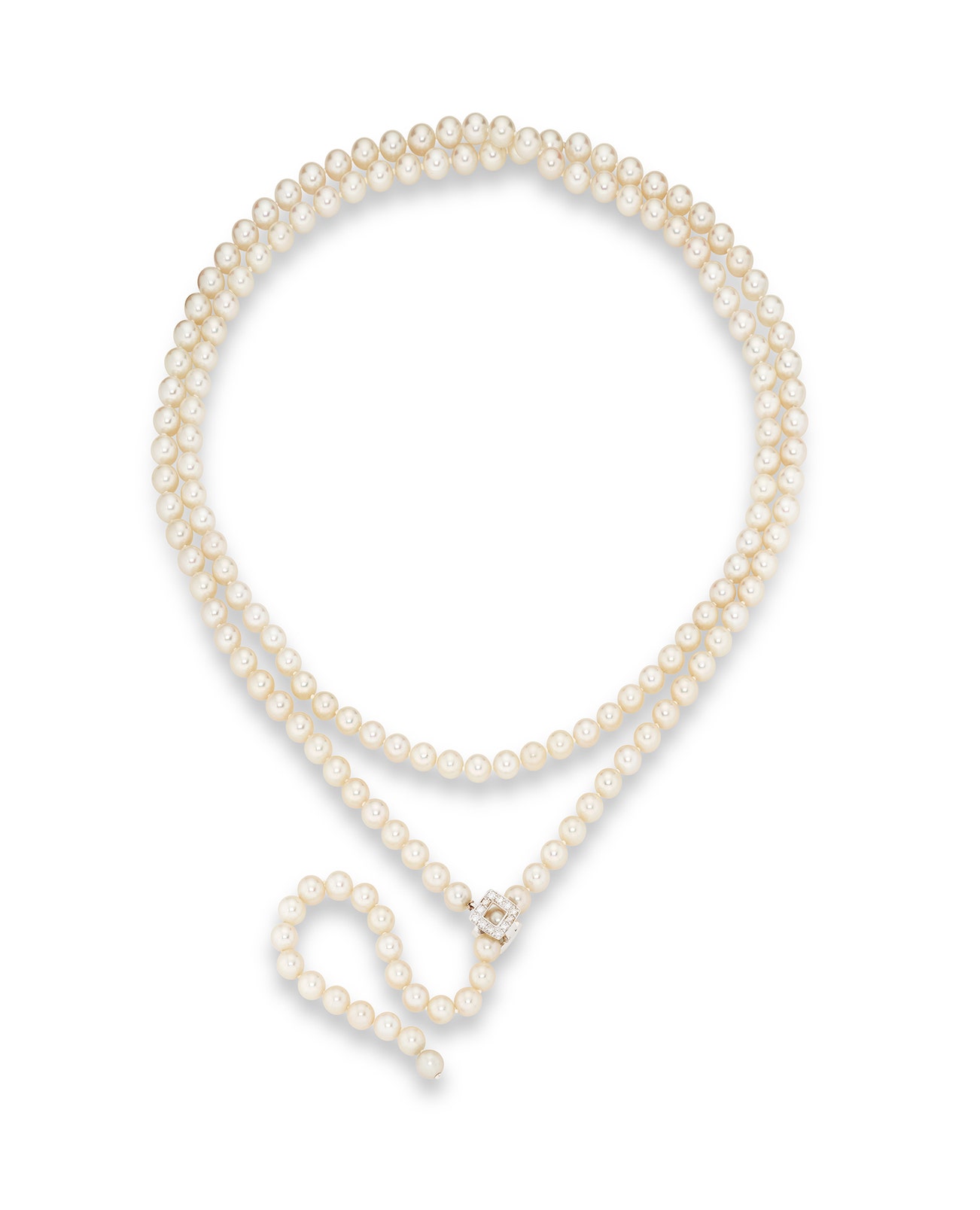 Composed of a single strand of cultured pearls measuring from approximately 6.95mm to 7.46mm, the clasp set with brilliant-cut diamonds, length approximately 1235mm, maker's mark for Mikimoto, pouch stamped Mikimoto.