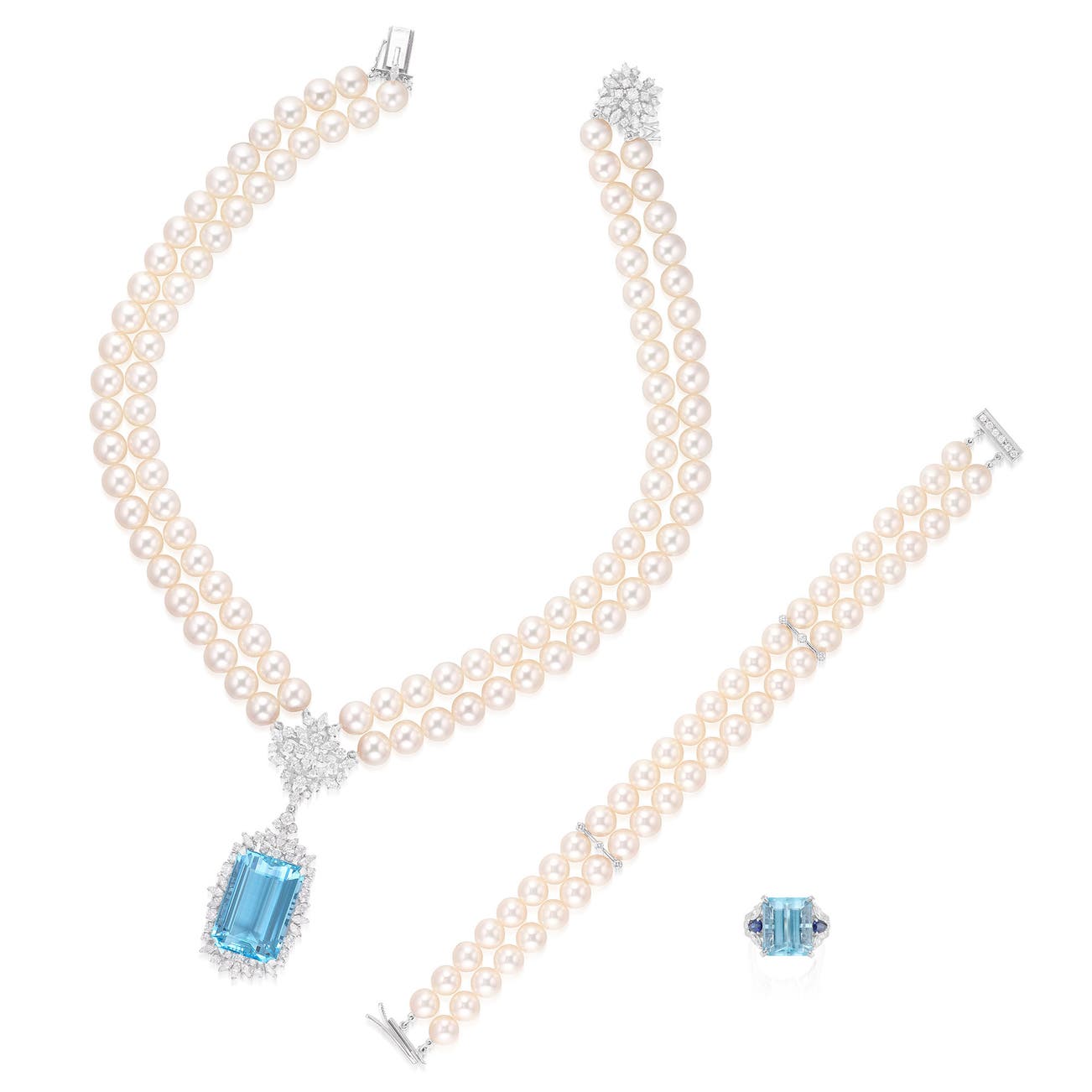Comprising: a double row cultured pearl necklace, suspending a detachable pendant set with a step-cut aquamarine, decorated with marquise-shaped and brilliant-cut diamonds, completed by a diamond-set clasp; a double row cultured pearl bracelet, highlighted with diamond-set dividers and clasp; and a ring set with a step-cut aquamarine, between marquise-shaped diamonds and pear-shaped sapphires, to the brilliant-cut diamond shoulders, necklace and ring mounted in platinum, bracelet mounted in white gold, all with maker’s mark for Mikimoto, pendant, necklace and bracelet lengths approximately 40, 350 and 170 mm respectively, ring size 6¾, case stamped Mikimoto.