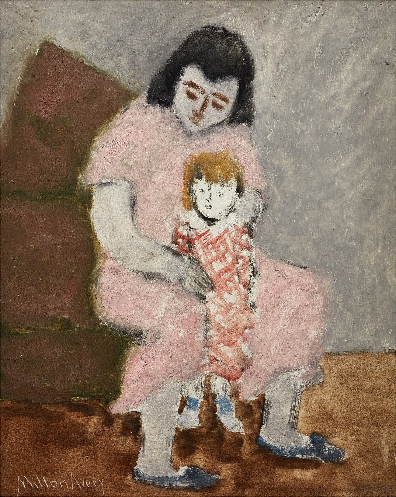 signed “Milton Avery” lower left; inscribed ""Young Mother + Child" by Milton Avery 1935" on the reverse