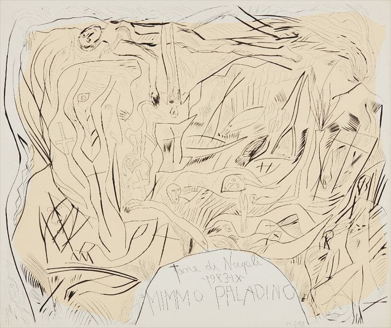 Etching and drypoint, on cream Chine collé to wove paper, the full sheet, folded and mounted to the colophon (as issued).