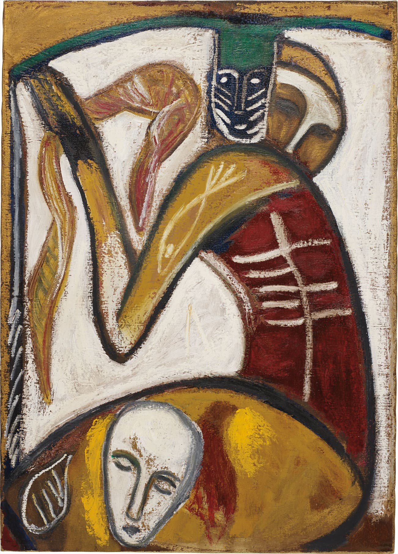 Signed and dated "m. paladino 1982" on the reverse; further titled "poeta all'ombra" along the stretcher.