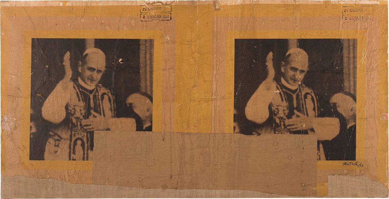 signed and dated 'Rotella/63' lower right; titled and dated '"la benedizione" 1963' on the reverse
