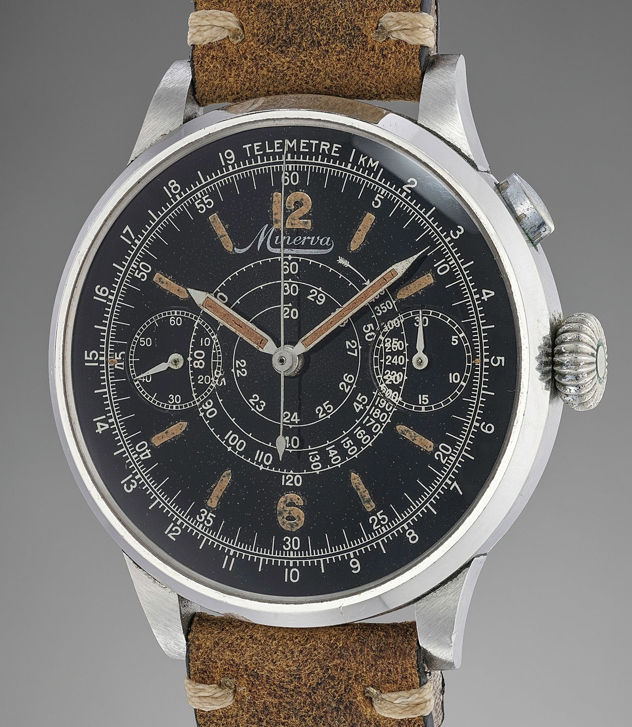 The present lot is a remarkable representative of the production of Minerva during the first half of the century. Impressing with its extremely large size of 45.5mm, the timepiece was obviously intended as a technical tool, most probably a pilot’s timepiece. It is powered by cal. 19/9CH, a monopusher chronograph movement developed first for pocket watches in 1909, and later for wristwatches too. The version featured in the present piece is remarkably the first version of this movement, characterized by the chronograph pusher at 2 o'clock. Later, the pusher will be integrated into the crown.
