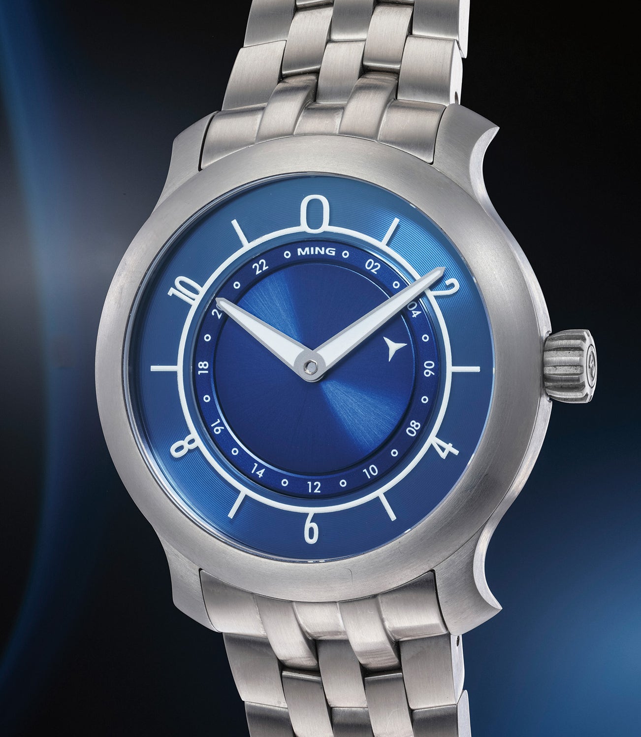 The present 17.03 features a three-part textured and sapphire dials with ‘floating’ numerals; flared lugs; circular symmetry and a classically proportioned 38mm titanium case with matching titanium bracelet.