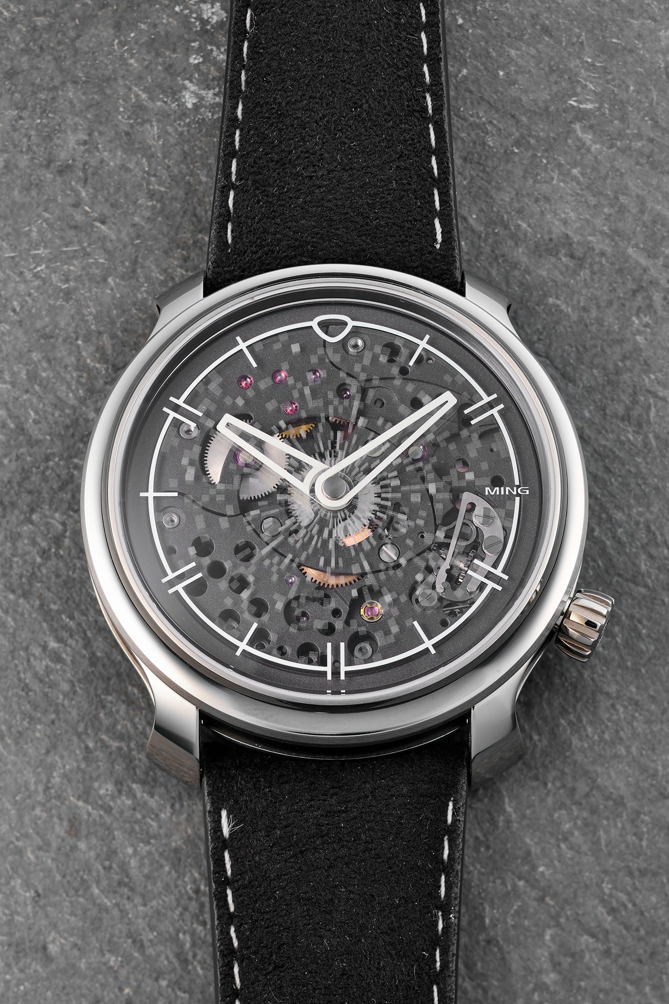 --Similar to other Ming collection wristwatches, the caliber ASE200.2 with micro-rotor is a highly modified Schwartz Etienne partially skeletonized movement with matte blasted black DLC coating and contrasting diamond-cut anglage.