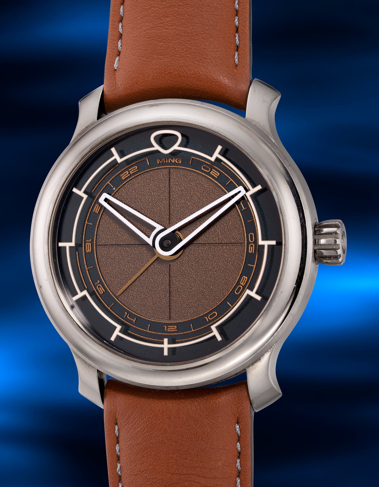 - Being a photographer as well, founder Ming Thein always includes visual layering on the watches. The dial of this dual-time watch has a dark cyan outer ring and a dark gold centre, topping with antireflective sapphire, it creates an inversion under different light conditions. The golden GMT markings are on top of the sapphire and white time indices are printed under the top crystal, with hands matching their respective colours that they indicate. The clever display of the markings and colours of the dial creates a mesmerizing effect, even creating an illusion that the numerals are floating.