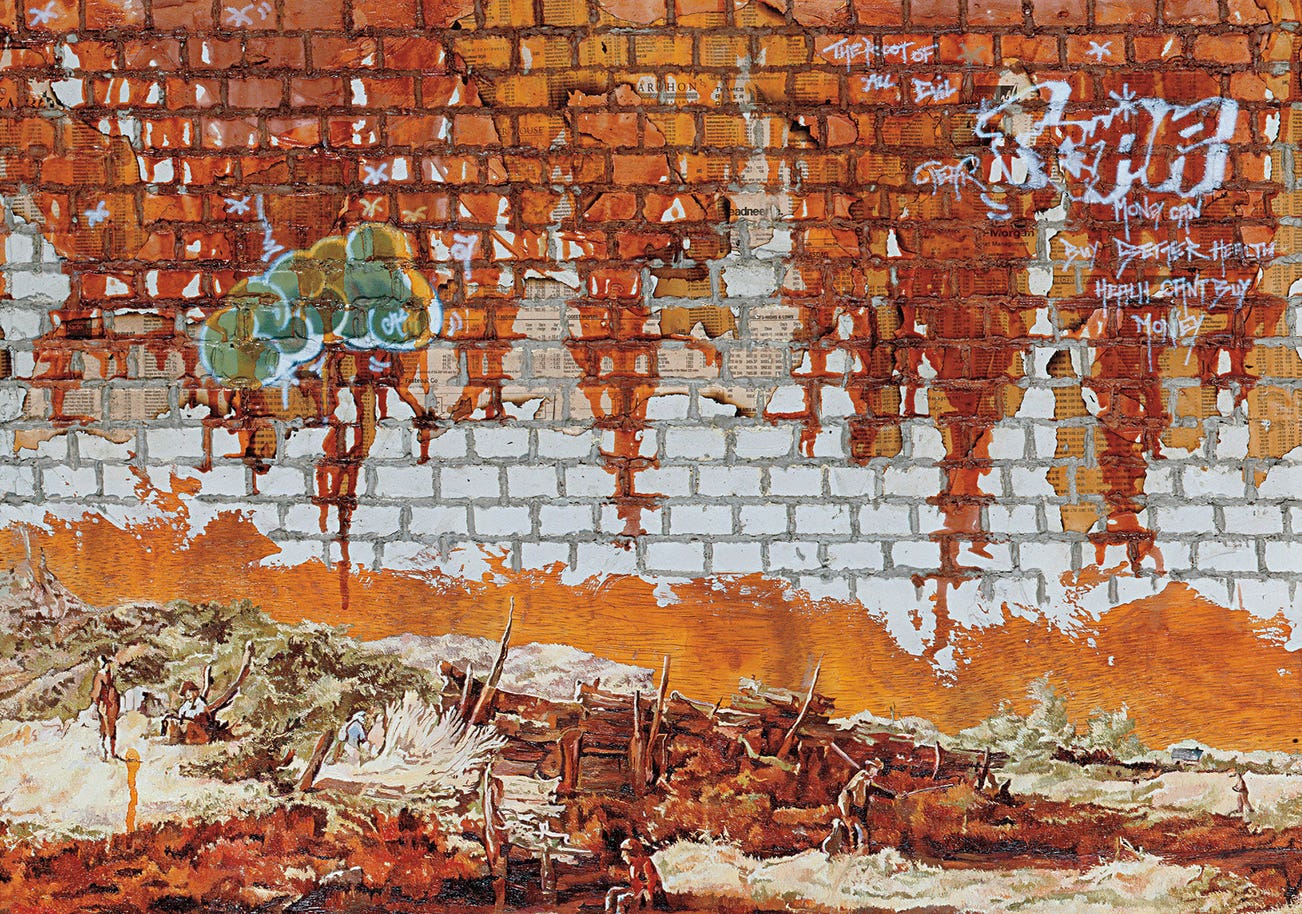 oil, spray paint, mortar compound and newspaper collage on board