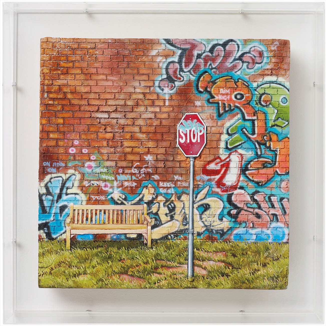 oil and mixed media on board in Plexiglas box