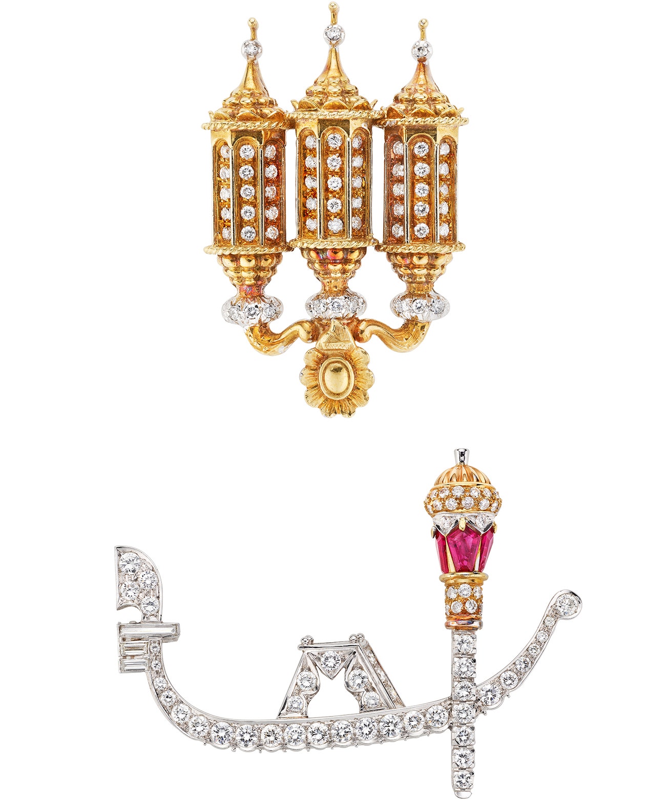 Set of Diamond and Ruby Brooches, 'Gondola' & 'Venetian Lanterns'