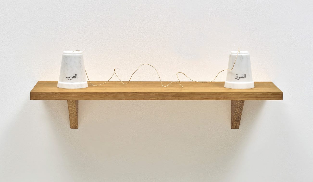 Two Carrara marble forms with carved typography (East and West in Arabic) and string on an oak shelf.