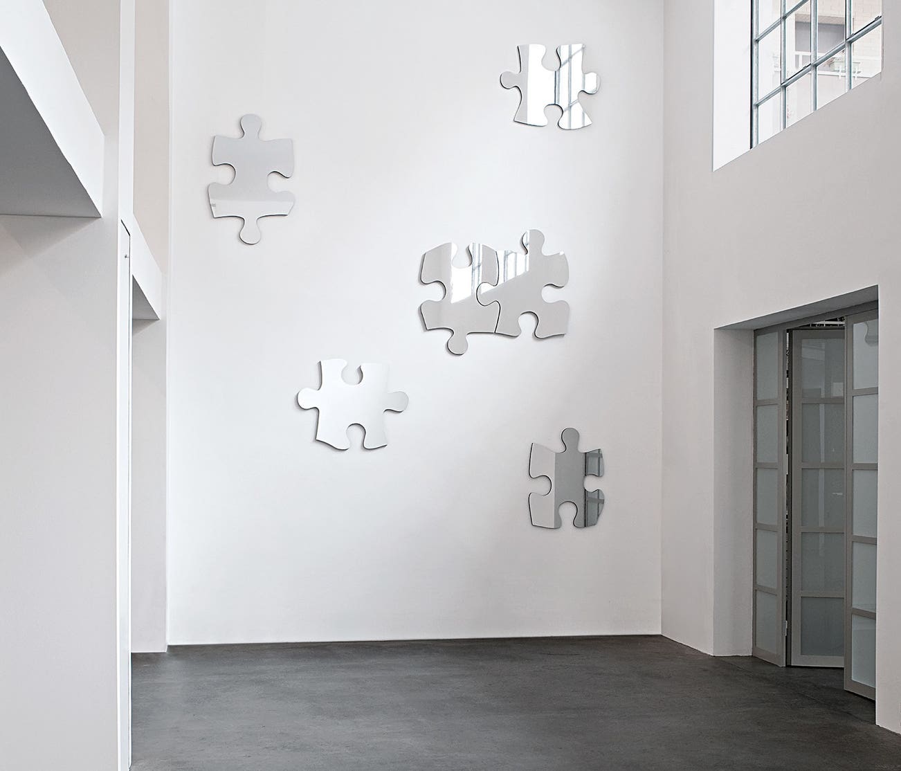The complete set of six mirror-polished aluminium plated MDF hardboard puzzle shaped elements, to be installed on a wall painted in matte white, grey, or black.