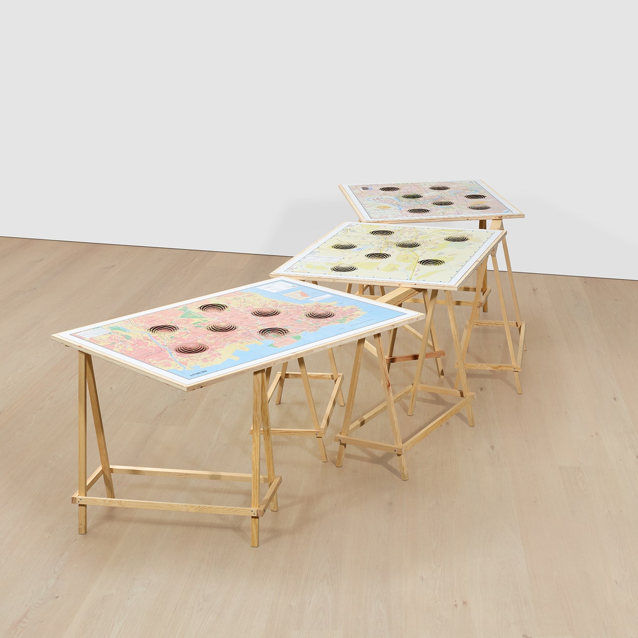 maps printed on paper, laid down on wood, in 3 parts, on 6 artist's wooden trestles