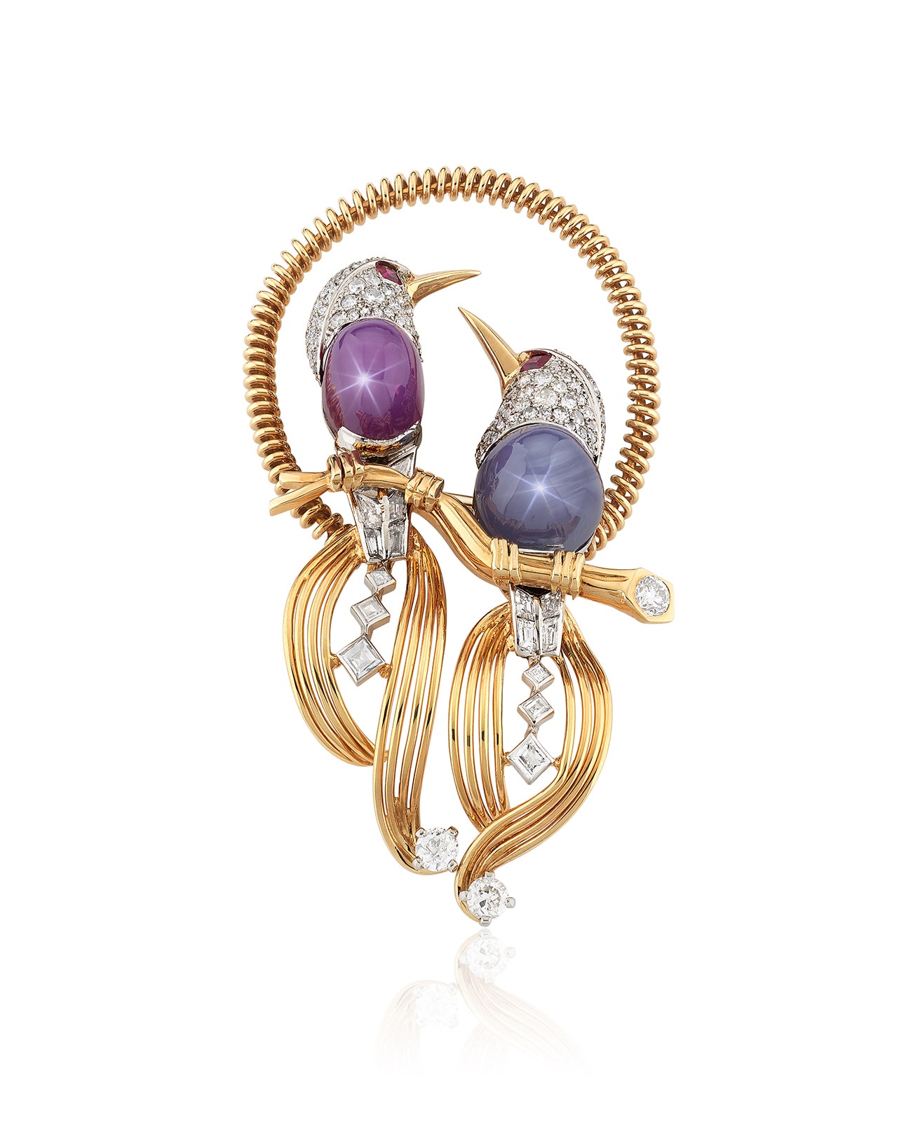 Star sapphire, star pink sapphire and diamond brooch, 'Love birds'
