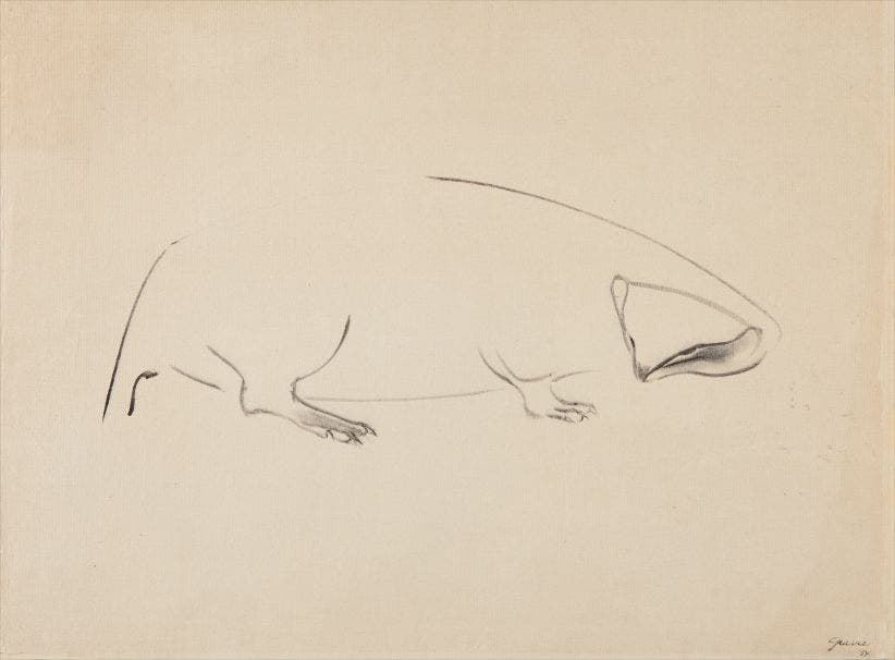 Sumi ink drawing, on tissue-thin Japanese paper backed to wove paper.