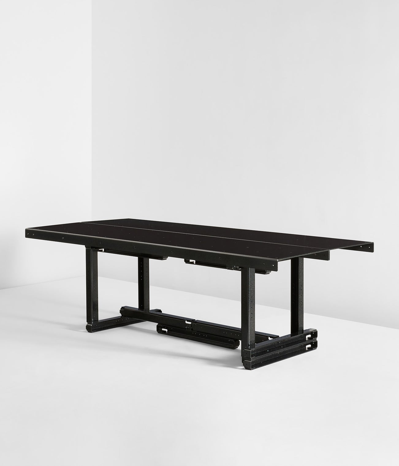 MOS, the New York-based architecture studio led by Michael Meredith and Hillary Sample, designed the present table as part of their “Model Furniture” series. In this series, the designers take architectural models as their reference point. They have taken a range of furniture types—from tables to ladders, shelving units, chairs, and cabinets—and reimagined these models as life-size objects. For example, the present table is the multi-step translation of an initial table into a model and then into a table again; the designers describe this process as a “reproduction of reproductions of reproductions.” The aluminum table is also powder-coated in shimmering colors, lending a subtle yet playful element to the surface of this otherwise conceptual project.