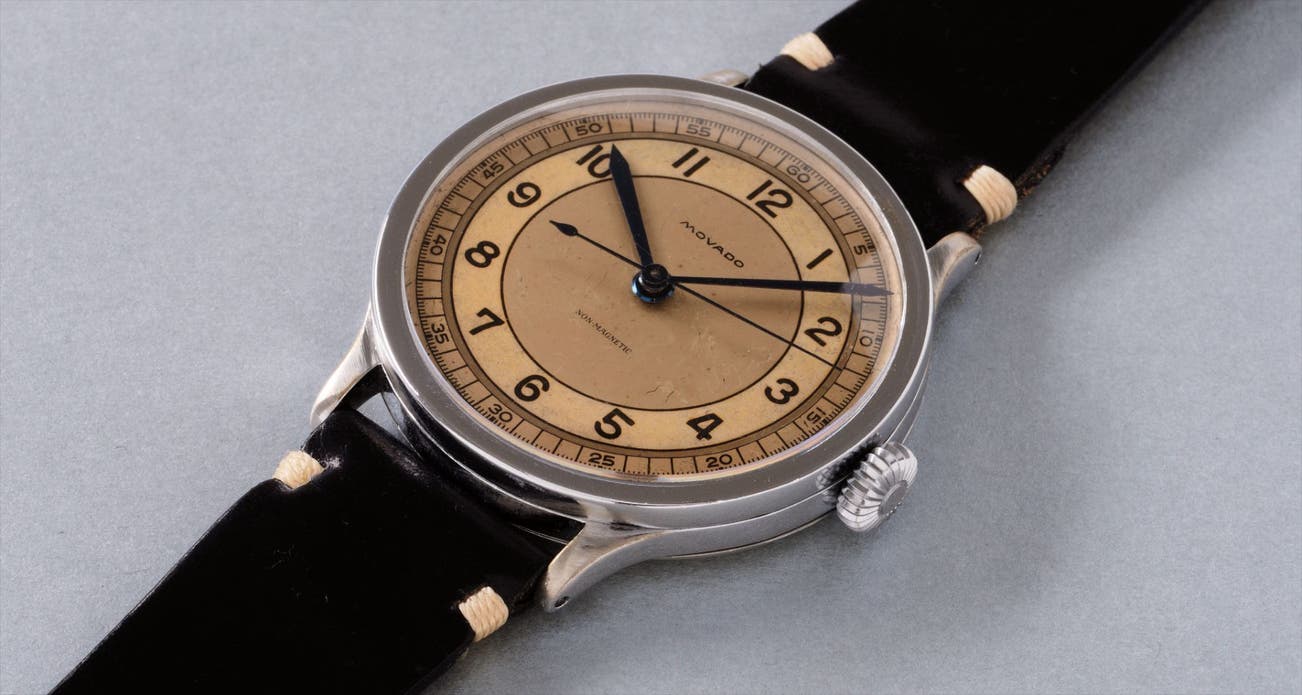 Movado, which in the constructed language Esperanto means “always in motion”, was founded by 19 year old Achille Ditisheim, a talented watchmaker who opened his workshops in La Chaux de Fonds in 1881 along with six watchmakers. The philosophy “always in motion” remained within the brand, which was constantly innovating in terms of styles and designs. With the present lot, Movado hits all the right notes. The large 40mm “non-magnetic” steel case is highly unusual for a timepiece from the late 1930s, and the vibrant three-tone dial conveys an alluring, masculine elegance. The dial has aged with grace to a warm vanilla color that provides striking contrast as background for the dramatic, deep blued-steel hands. The present lot, with its oversized case and visually arresting dial is a fascinating watch for the connoisseur, and its rarity is such that we have never seen another like it.