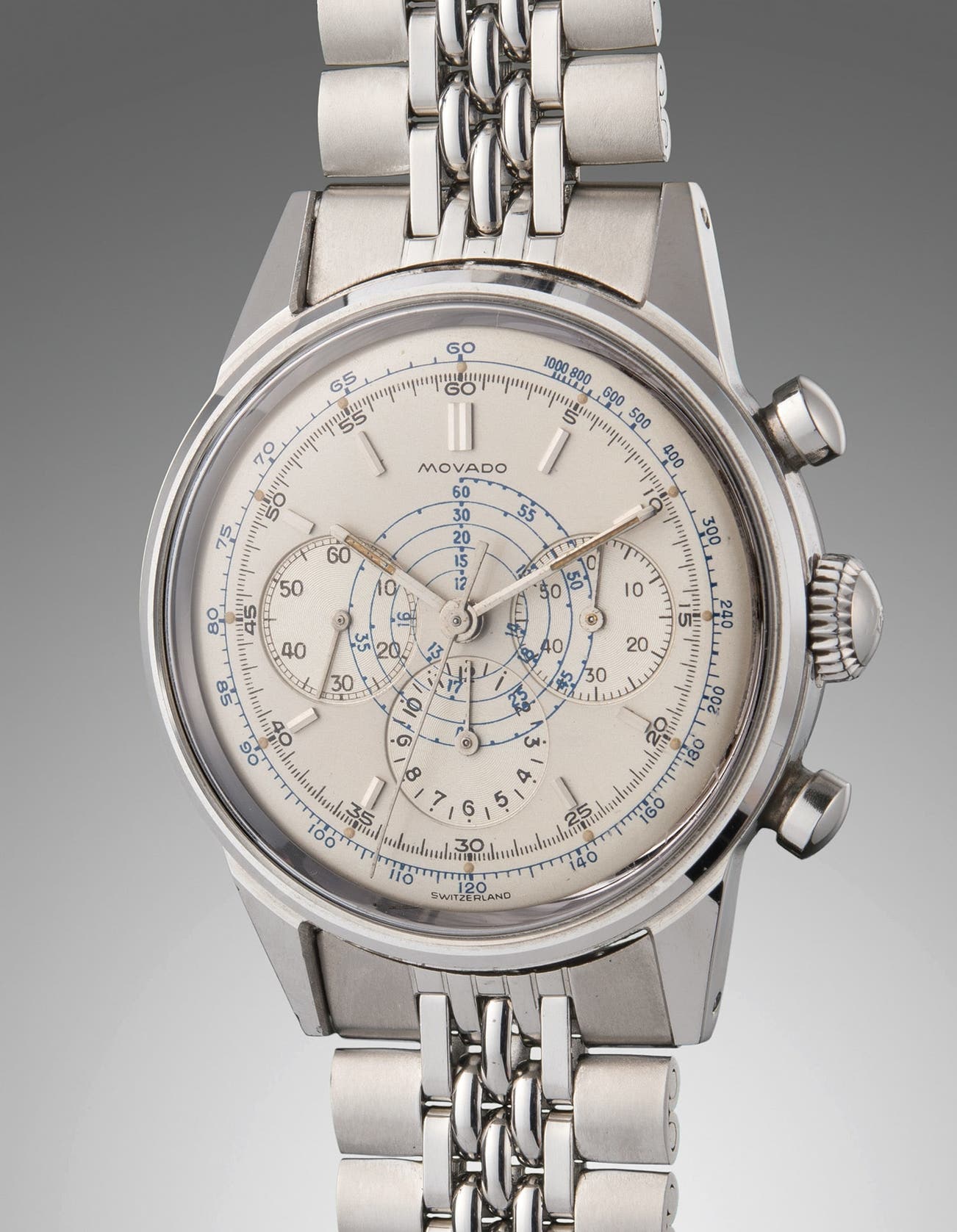 The present watch is in superb condition, with a well-preserved case and bracelet showing little signs of wear. This is reinforced by the sharp lugs and crisp lines observed throughout the case. Later Movado Sub-Seas would become increasingly bolder and sportier, to adjust to the evolving aesthetics of the 1960s and 1970s, but the current example combines the best of the early-mid century with later masculine elements. The eggshell white dial contrasts beautifully with the robin’s egg blue of the tachymeter dial - still vibrant after over half a century of existence.