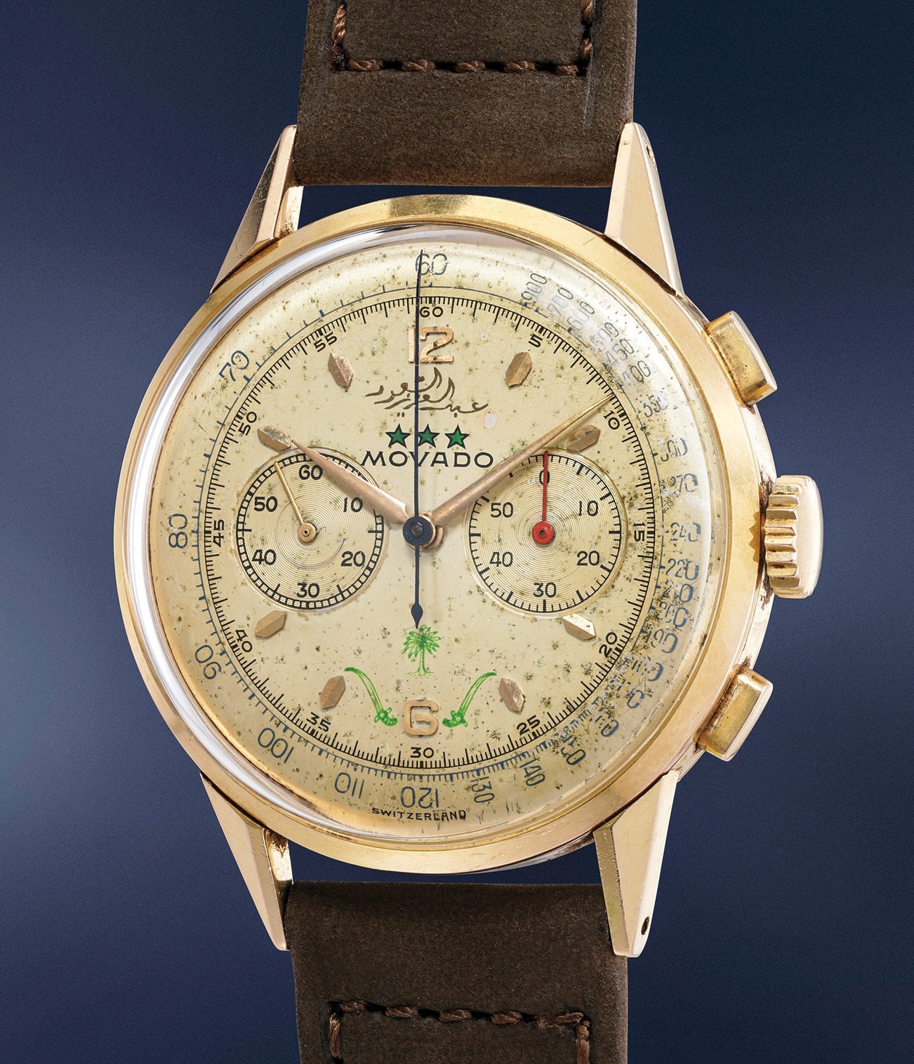 The present watch perfectly exemplifies this trend. Offered in exceedingly honest condition with an absolutely unpolished case, the dial of this timepiece is personalised with the green Saudi swords and palm at 6 o’clock, and the designation name of the Saudi ruler Abdul Aziz Al Saud, King of the realm from 1932 to 1953, at 12. It is a more than educated guess that the present piece was offered by the King in recognition of services made to the country or possibly as token of friendship to a diplomat.