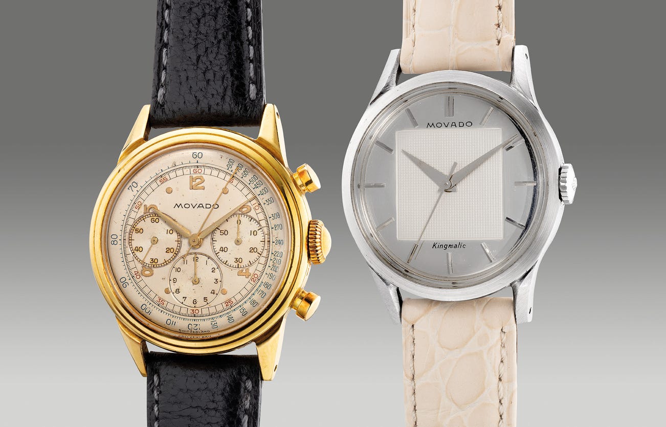 The present pair of Movado wristwatches consists of a beautiful yellow gold chronograph wristwatch ref. 9038 from the 1950s and a stainless steel time-only wristwatch ref. 11179 from the 1960s. With acclaimed heritage of over 139 years of watchmaking, Movado was first established in 1881 by Léopold Achille Isidore Ditesheim, who was only nineteen at the time under the name “LAI Ditescheim & Freres SA” and was later changed to Movado in 1905. Since then, the firm has continued to thrive within the industry creating elegant timepieces with varying complications.