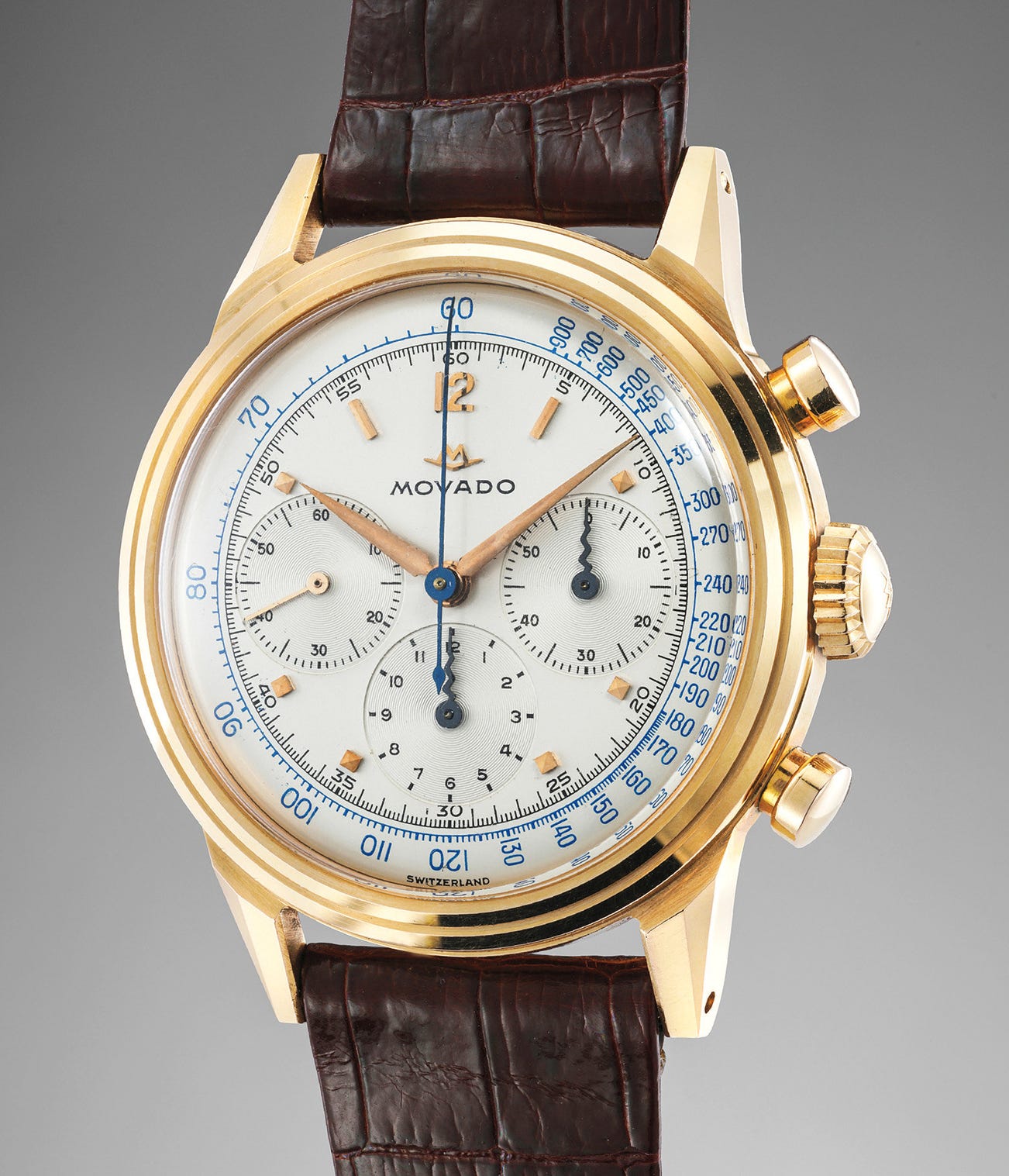 The dial as well is a perfect example of mid-20th century design, striking the balance between graphically intense dials of the first half of the century and the much cleaner designs of the second half. The fifth of a second combined with Arabic 5 minutes divisions are present, a trait typical of the 1940s, together with a vibrant blue tachymeter scale. A note of quirkiness is offered by the hands: the main hour and minute hands feature an intriguing “obelisk” style, boosted by the serpentine hands of the subsidiary counters at 3 and 6 o’clock.