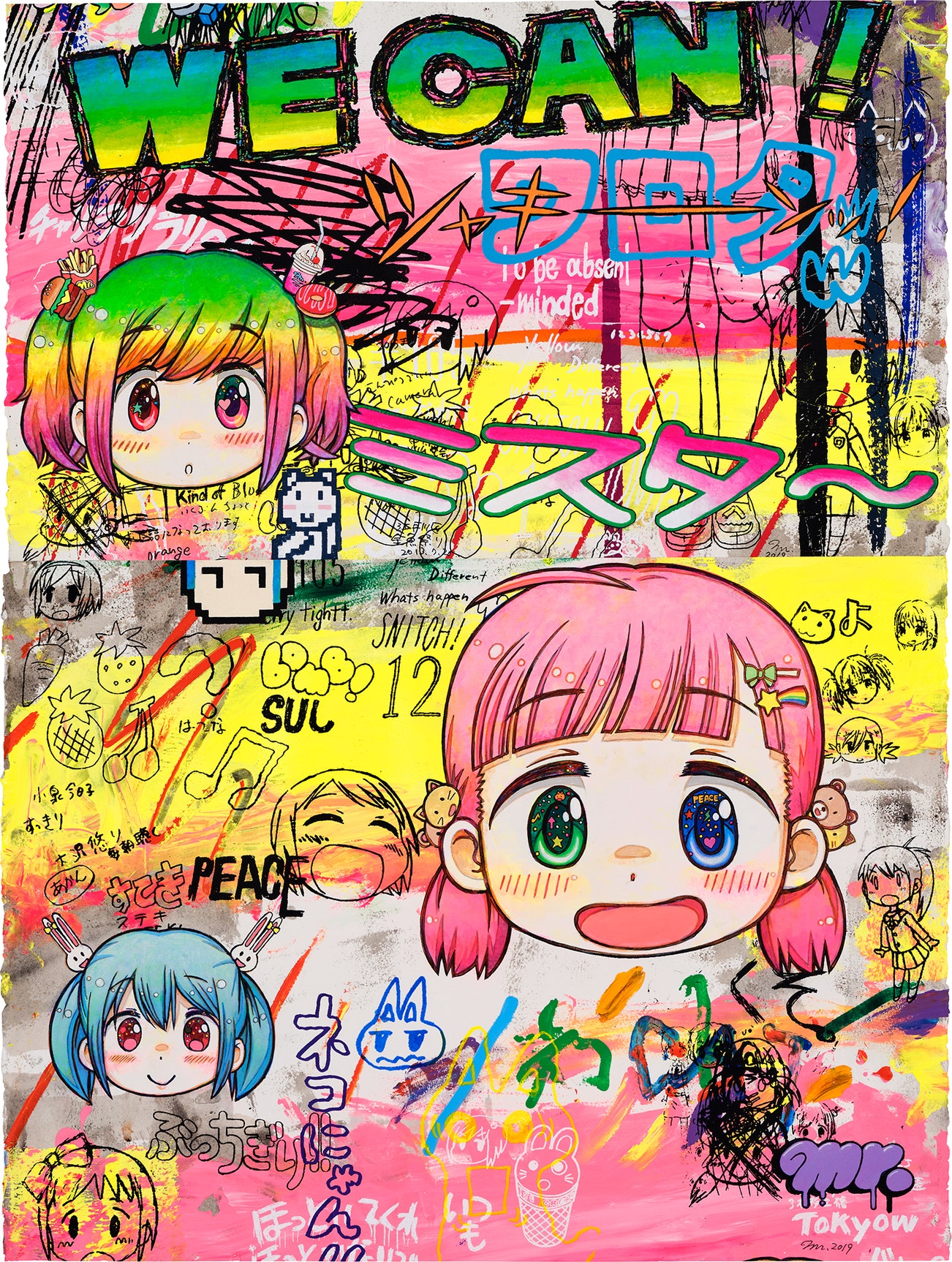 acrylic, pen and silkscreen print on paper