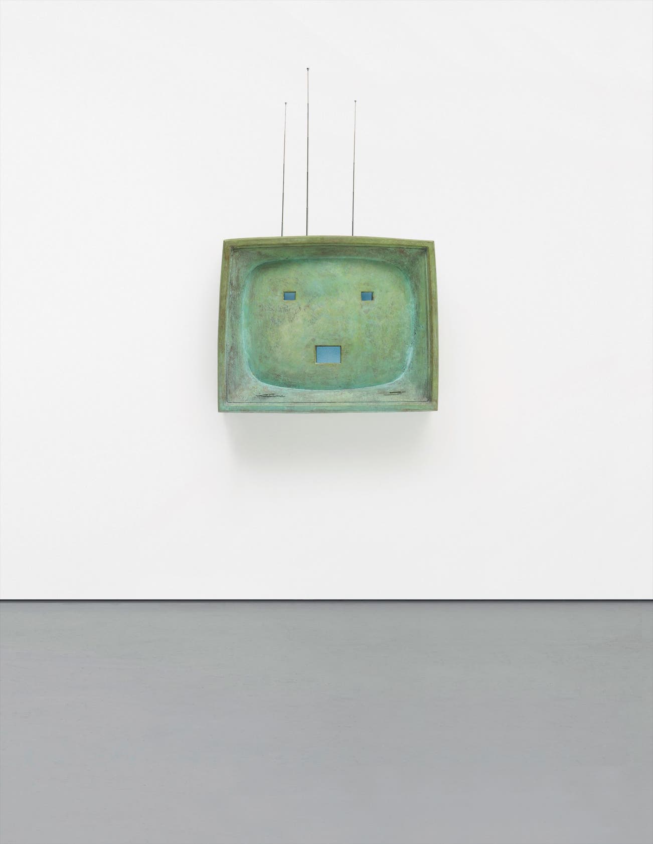 Patinated cast bronze of a Kuba televion with three television monitors, antennae, and plug,