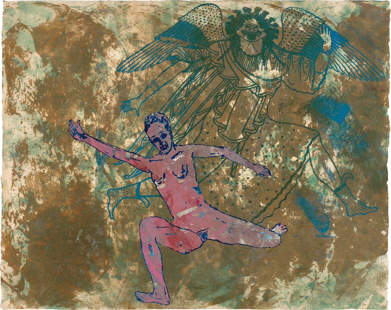 Unique woodcut and collage with hand-coloring, on wove paper, the full sheet.