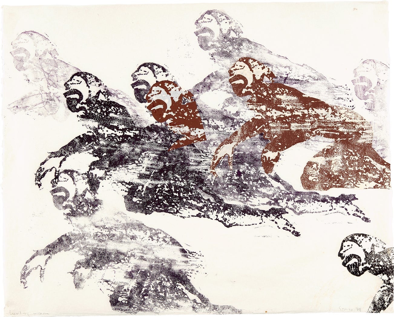 These two unique, hand-printed collage works— Crawling Woman (1984) and Goddess Nut and Torture Victim (1991) — as well as the benefit print We Are Pro Choice (1992) appropriate both idealized and real female forms from a photographic and printed sources. Crawling Woman is derived from a late 1960s Life Magazine photograph of a wounded Vietnamese woman shielding her baby. Printed as a single image on a single sheet, Crawling Woman represents one “hieroglyph” in Spero’s alphabet that she recycled in numerous larger works during the 1980s and 1990s. In Goddess Nut and Torture Victim, the “Ideal” and the “Real” registers of imagery are starkly juxtaposed: the ancient Egyptian goddess protectively arches over the corpse of a young Guatemalan woman tortured to death during the height of the civil war in that country sourced from an Amnesty International newsletter. A feminist avant la lettre, Spero was also a committed activist who supported, among many political causes, the Pro-Choice Movement since Roe v. Wade became U.S. law in 1974. As the ‘cast’ of female characters from prehistory to the present in We Are Pro Choice suggests, women have attempted to assert their right to control their own bodies for millennia.