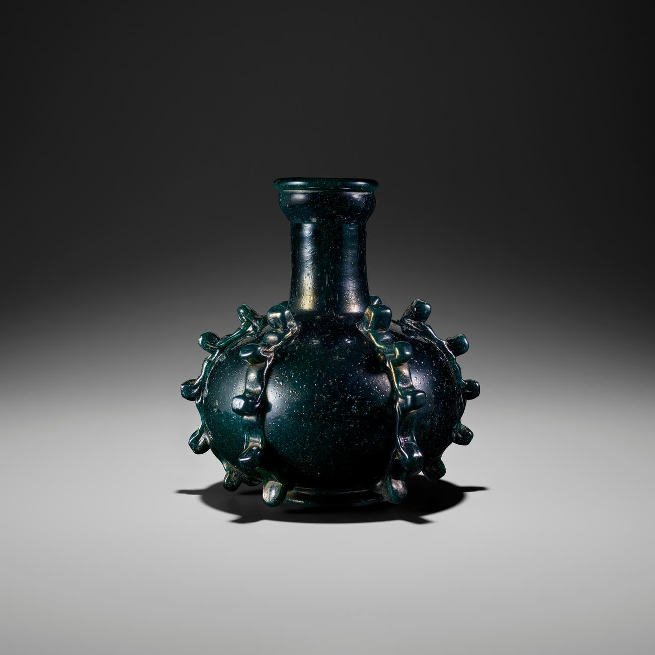 Coloured iridescent pulegoso glass.