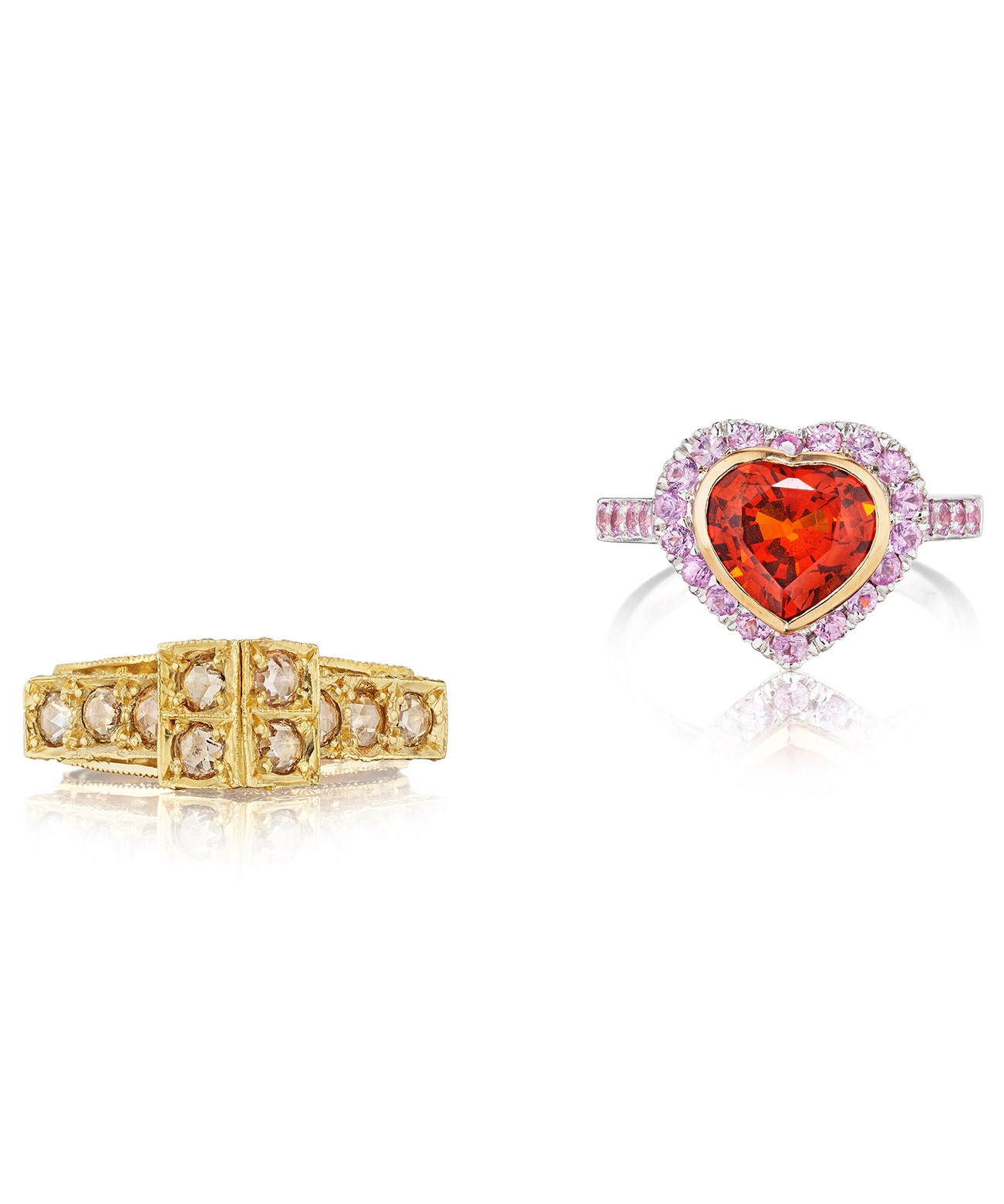 Comprising two rings, one set with a heart shape spessartine garnet, decorated with round pink sapphires; one set with rose-cut diamonds, mounted in 18K gold, size 8 1/4 and 6 1/2, signed Nardi with maker's mark.
