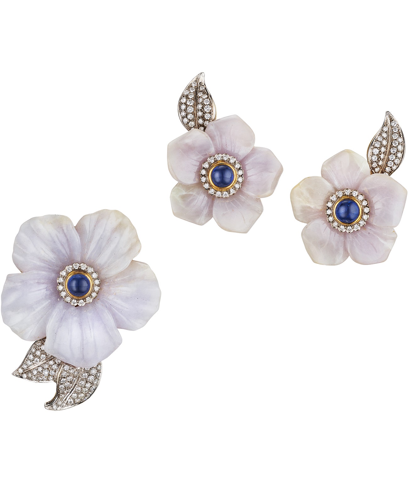 Chalcedony, Diamond and Sapphire Brooch and Earclips