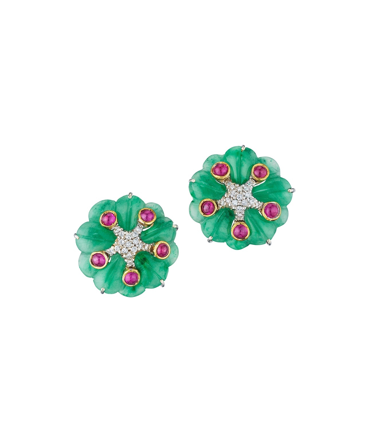 Set with carved dyed jadeite jade, accented with ruby cabochons and brilliant-cut diamonds, mounted in 18K gold, signed Nardi.