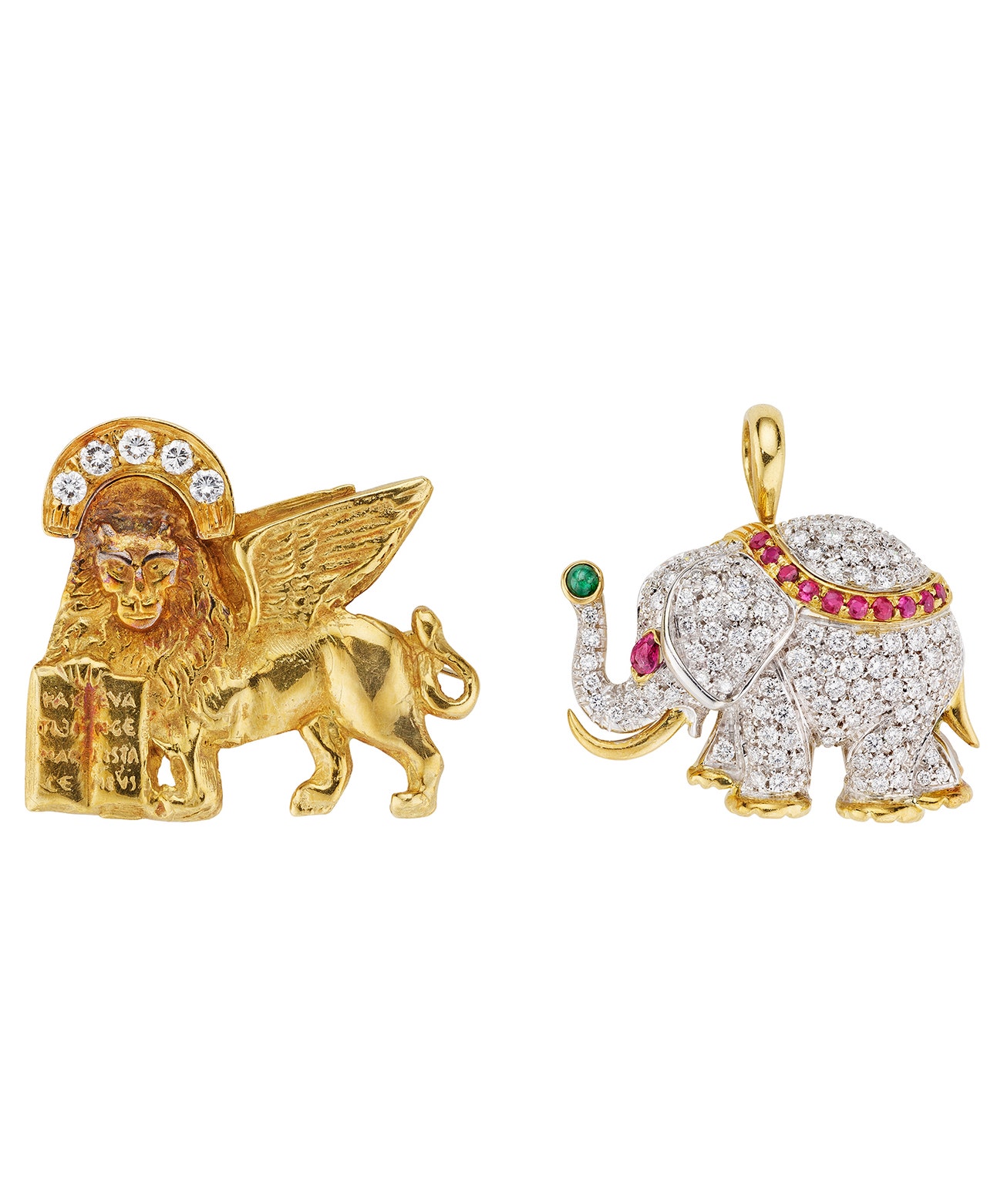 Comprising of two brooches, set with mixed shape rubies and brilliant-cut diamonds, accented with an emerald cabochon, mounted in 18K gold, length measuring approximately 1 inch and 3/4 inch, signed Nardi, with Italian assay mark.