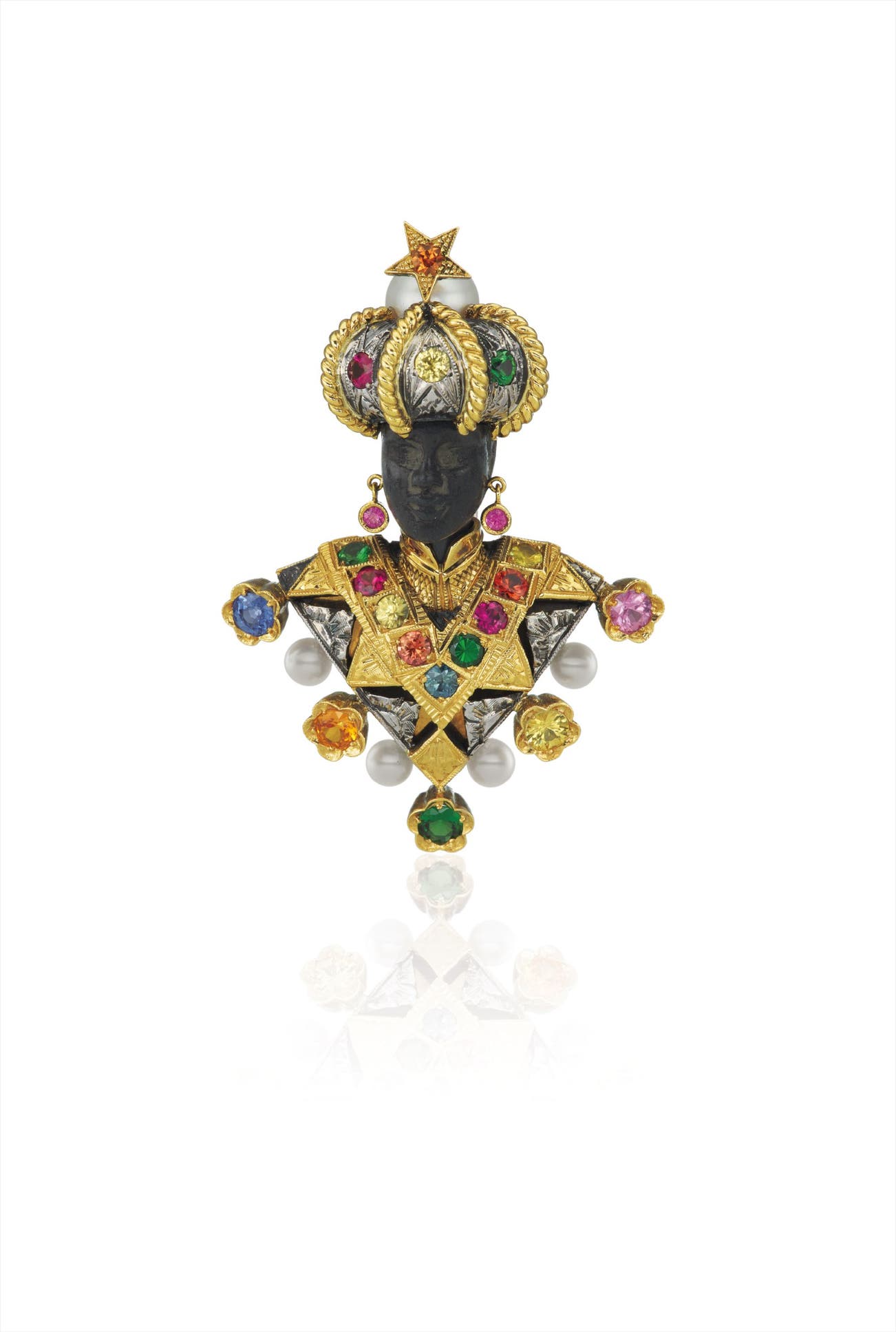 Designed as a blackamoor with a carved ebony head, wearing a textured gold turban and tunic enhanced by circular-cut rubies, multi-color sapphires, tzavorite garnets, and cultured pearls, mounted in 18K yellow and white gold, length 2 1/4 inches.