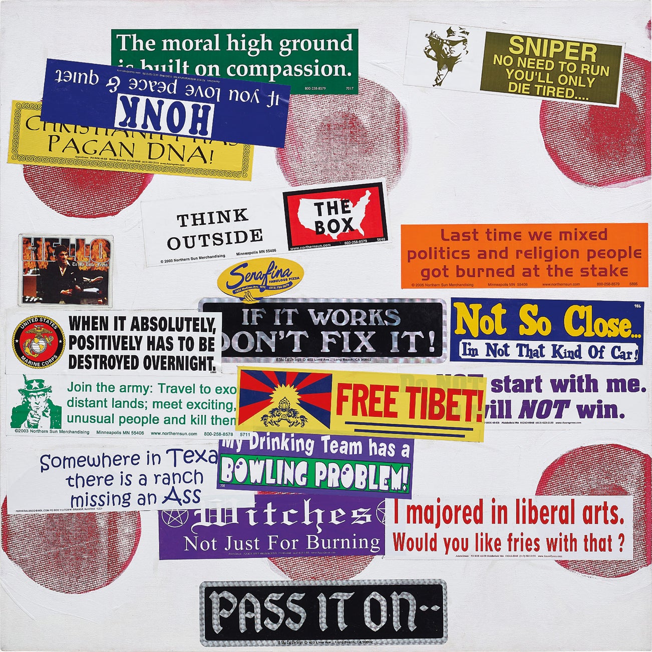 acrylic, silkscreen and stickers on canvas