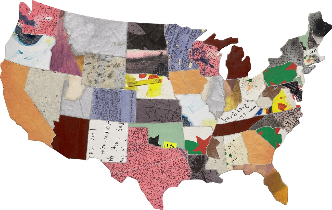 oil, alkyd, latex, ink, silkscreen, flashe, aluminium paint, wooden stick, bumper sticker, dirt and nylon thread on canvas