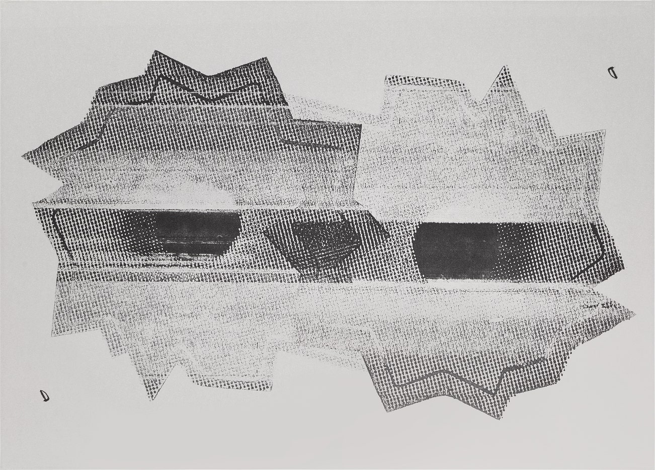 Screenprint, on silver metallic paper, the full sheet, mounted to Plexiglas.