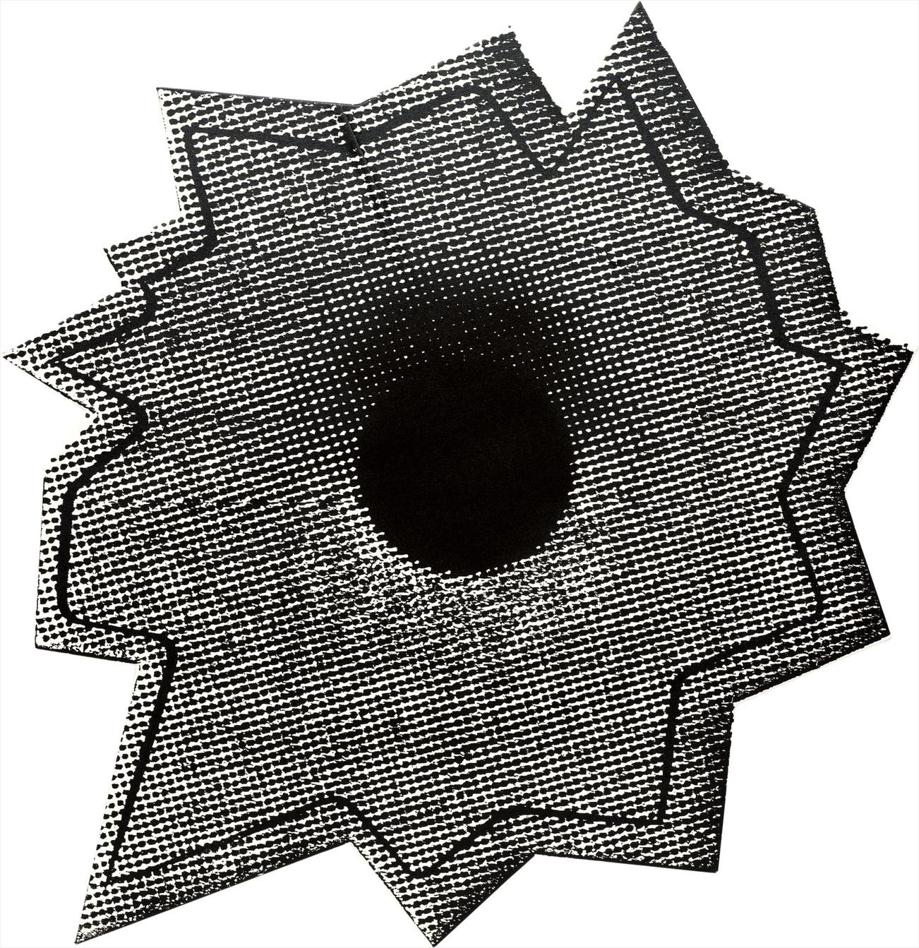 The work of Nate Lowman is an emotional exploration of American culture. With its matrices of ink dots and a shape reminiscent of an action burst, Escalade, 2005-07, gives a nod to Pop art icon Roy Lichtenstein’s comic book-style paintings. While Lichtenstein’s bursts of action are indicative of an attraction to the impact of commercial printing, Lowman’s bullet hole imagery instead evokes a façade of tough guy machismo. Lowman’s eye-catching iconography is no less a visually communicative explosive force. Sourced from trompe-l’oeil stickers of bullet holes meant to be applied to the glass of car windows, Lowman’s bullet holes conjured up notions of urban masculinity, menace and aggression.