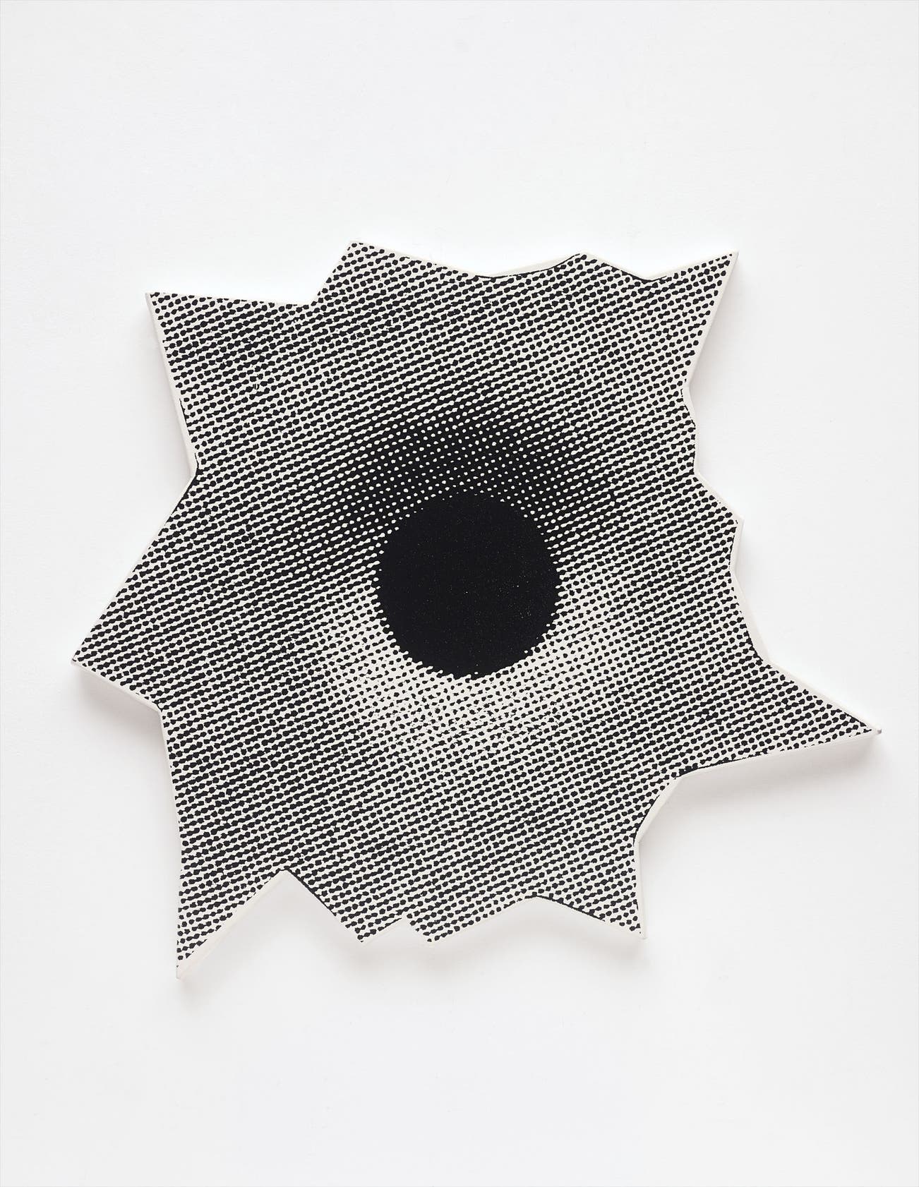 The large scale canvas enables a co-operation between medium and subject matter. The evocation of the shot of the gun can be seen in the commanding size of the piece, imposing and reflective of a moment of dramatic impact. The amplification of the sound is represented in the expanding cloak of dots that emerge from the void, lending the piece an added dimensionality in the comparison of depths. Thus both physically and psychologically escaping the constraints of the traditional picture frame, the present lot explores the distinction between destruction and creation. ‘A lot of my art is about violence and crime. I also really like shaped canvases. I’ve always loved Ellsworth Kelly, I love all the Brazilians, the Neo concrete People like Lygia Clark. I always wanted to make these shaped canvas objects but I didn’t want to make a Blinky Palermo with jagged edges; I wanted to make something else. The bullet holes were a good opportunity to have the cultural things that I’m interested in come together with that.’ (Nate Lowman, Bad Day Magazine, 2009)