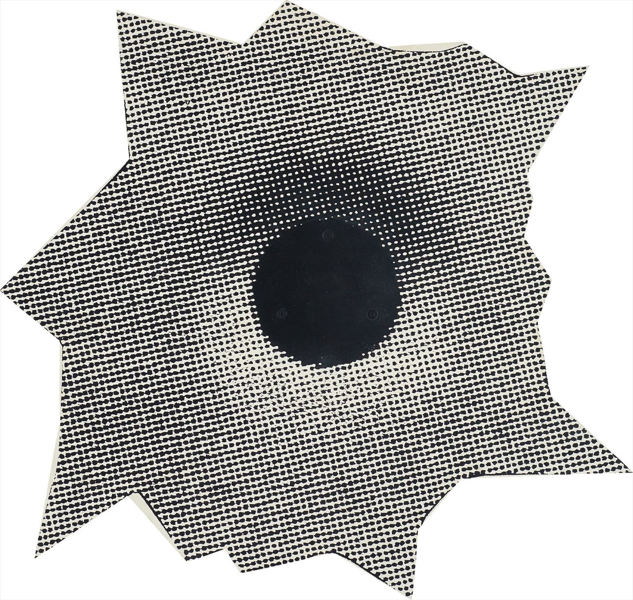 A visual flood of grit, menace, and violence enraptures the viewer upon sight of the present lot, Nate Lowman’s Outdoor Bullethole #1, 2005. The bullethole embodies aggression yet is referentially balanced by the cartoon-esque deliberation with which the work is crafted. Lowman’s masterful construction of the cavernous void left by the trail of an imaginary bullet sharply piercing a city wall, juxtaposed with the delicately frivolous Ben-day dots, speaks to a deep-seated, primal fear that inundates American contemporary culture. Darkly poetic in its raw appeal and energetic in its earnest inquiry of Pop Art, the present lot eschews a faint though poignant notion of genesis in its implication of destruction. In the production of a violent iconography, the work lays the foundation for healing the deeply entrenched wound and a fundamental breeding ground for new optimism.