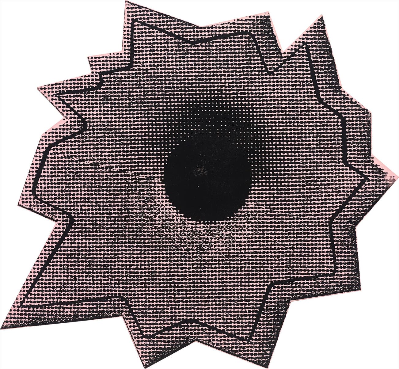 Lowman’s Bullet Holes evidence the formal and conceptual influence of his Pop Art predecessors. In Pink Escalade the adeptness with which he abbreviates physical force brings to mind the comic adaptations of Roy Lichtenstein, whose benday dots also pervade in Lowman’s oeuvre. The serial nature of the Bullet Holes also recalls the Death and Disaster works of Andy Warhol, a project predicated on a similar fascination with violence in mass culture. Lowman’s reconsideration of the rectangular canvas is also tied to the formal breakthroughs of predecessors: “A lot of my art is about violence and crime. I also really like shaped canvases. I’ve always loved Ellsworth Kelly, I love all the Brazilians, the Neo concrete people like Lygia Clark. I always wanted to make these shaped canvas objects but I didn’t want to make a Blinky Palermo with jagged edges; I wanted to make something else. The bullet holes were a good opportunity to have the cultural things that I’m interested in come together with that” (Nate Lowman, Bad Day Magazine, 2009).