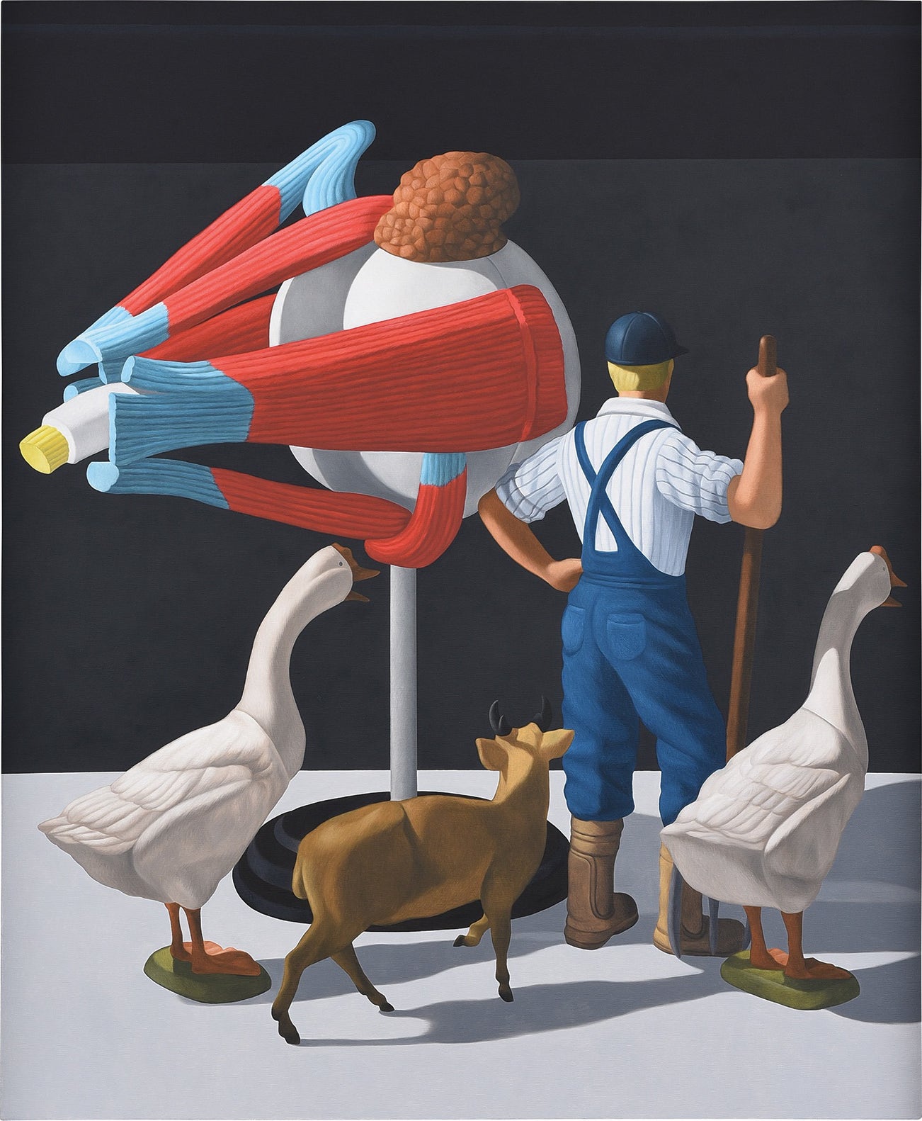 Beneath the ordered compositions and painterly aesthetic of Natee Utarit’s canvases resides a latent anxiety that expresses the complexities and contradictions in the experience of modern life. In The Dawn of Day, Utarit’s accomplished painterly style and use of traditional compositional framing most closely associated with classical still life painting lulls the viewer into a false sense of familiarity. What appears to be a scene of a worker surrounded by a group of animals is disrupted by the inclusion of a scientific model of an eyeball which draws our attention to the unnatural scale of the elements in the painting, and the eventual discovery that all of the objects in the painting are artificial – revealed most clearly by the plastic base supporting the two geese. Foregrounding the artifice of his subjects, Utarit complicates earlier philosophies of painting that were concerned with creating accurate representations of reality within the picture plane, and critically redeploys the techniques from that early period of Western art history. The realistic rendering of his lifeless subjects results in an uncanny stillness and Utarit reveals his critical perspective through a complex blurring of reality and artifice.
