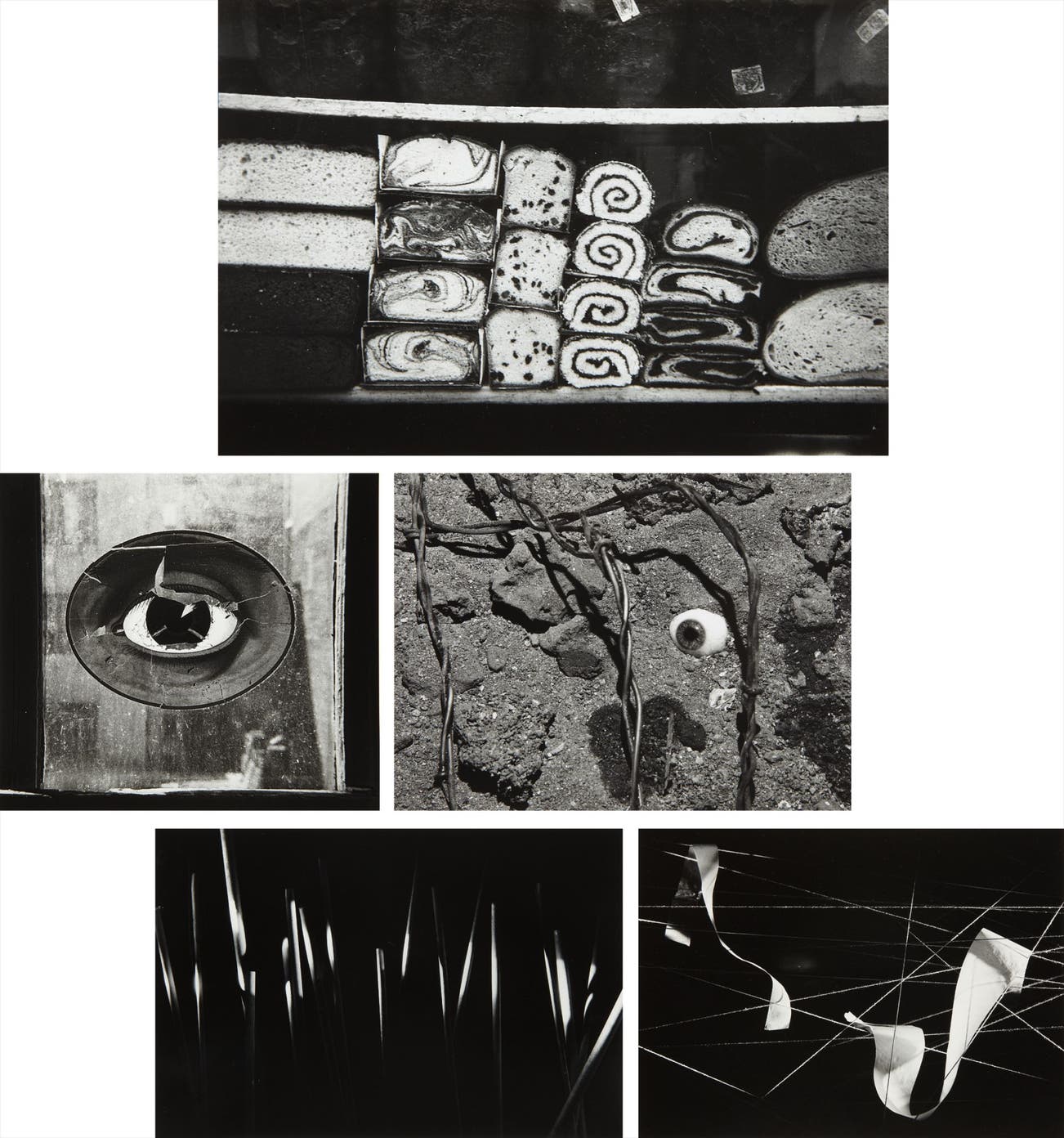 Titles include: Cakes in Window, 1938; Eye and Barbed Wire, 1939; Eye on Window, 1943; Wooden Dowels, 1939; Paper on String, 1938; Untitled, n.d. (3 prints)