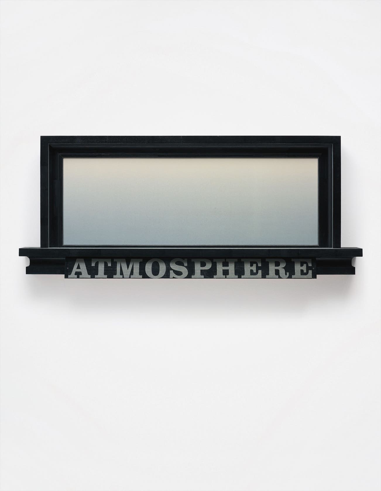 Presented in a thick black frame, Atmosphere is a slice of a colossal, backlit sky which might suggest a specific environment but rather is a scrupulously rendered universal composite. Elegantly lit and exquisitely smooth, we experience not just the presence but acutely feel the effects of atmosphere, inflected by the alabaster glow and the azure blue sky of an afternoon sun. The title functions as a legend, stenciled in grey block letters, allowing our eyes to come to terms with the vista before us. Not quite painting, resolutely not photography, the present lot functions primarily as a three-dimensional wall structure characterized by a custom-built, spacious frame essential to the work it encompasses. Reminiscent of the density and austerity of 16th century Dutch frames, Jenney often prepares his canvases to fit the frame openings, as opposed to retroactively adding a frame to the painting for sheer embellishment. The idiosyncratic result is a style in which narrative truths are cultivated in the most simple of relationships existing between objects. Atmosphere is Jenney’s answer to a world glorifying both the matter-of-fact and the conceptual.
