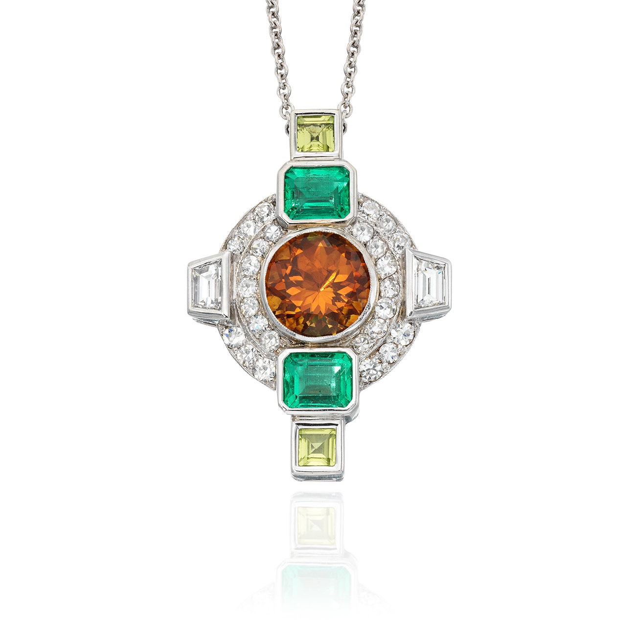 Set with a circular-cut citrine weighing 3.53 carats, Between step-cut emeralds and peridots, accented by single-, circular-cut and trapezoid-shaped diamonds, mounted in 18k white gold, length approximately 17 inches, signed Neiman Marcus.