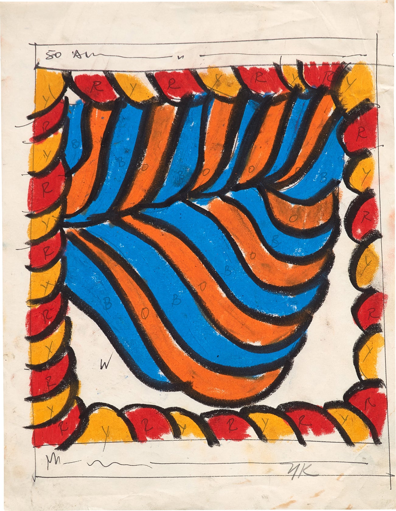 Oil stick, ink and graphite drawing on paper.