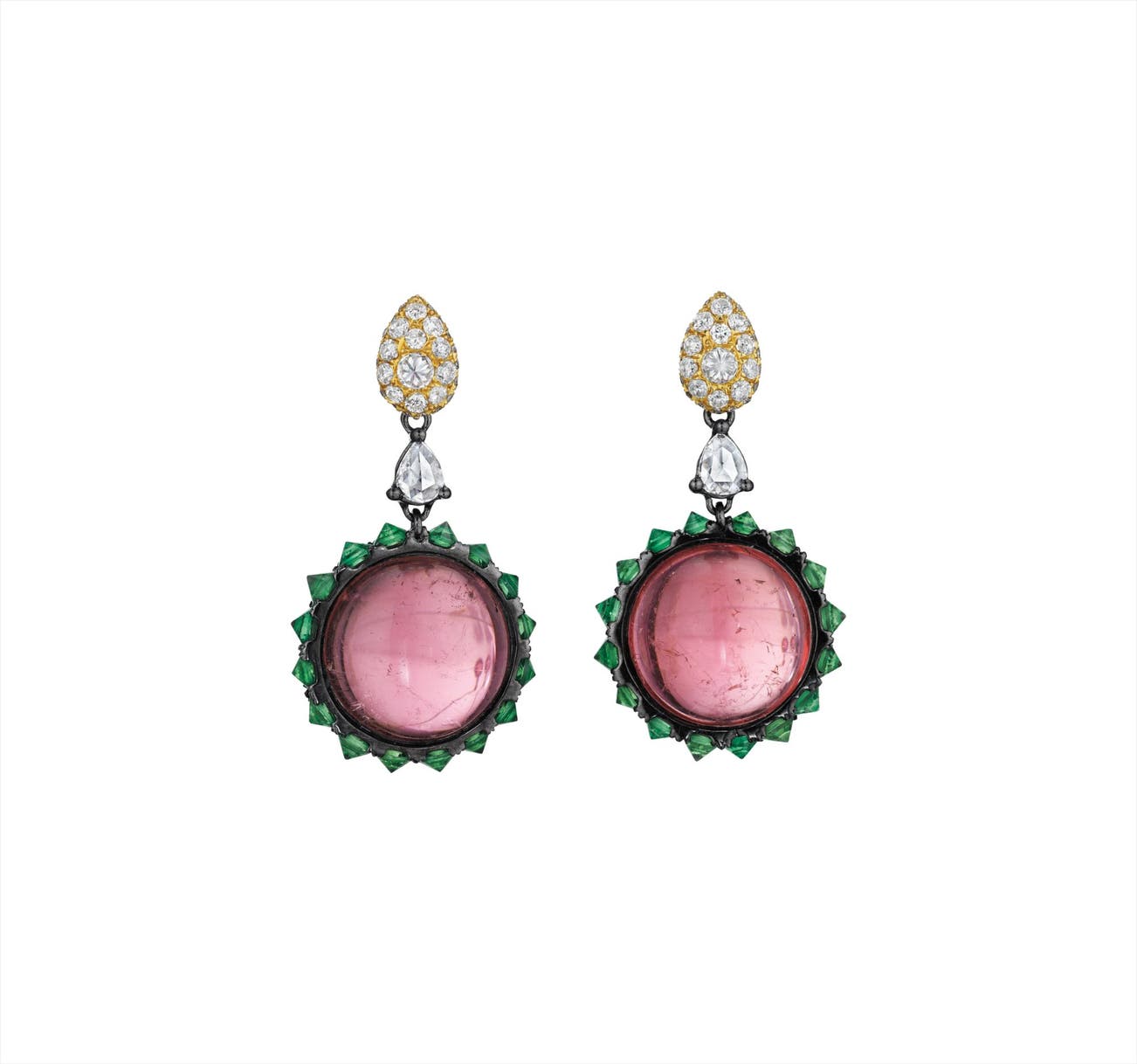 Each suspending a cabochon tourmaline, weighing approximately 15.30 carats in total, within an inverted-set circular-cut tsavorite frame, from a pear-shaped rose-cut diamond link, to the pavé-set diamond surmount, mounted in silver and 18K yellow gold, length 1 1/4 inches, pendant is detachable.