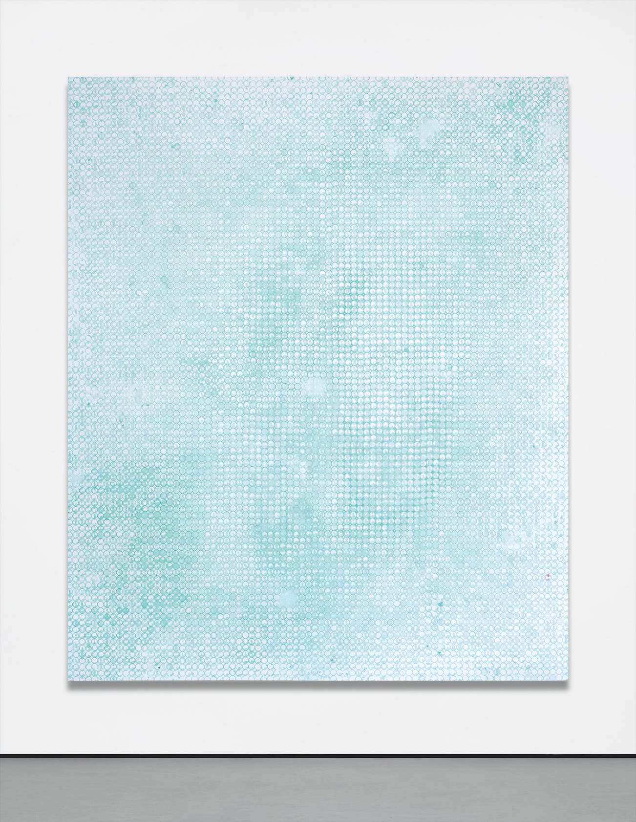 Actively involved in the Brooklyn based Still House Group, Nick Darmstaedter’s work pays homage to the Duchampian readymade as well as titans of American minimalism and Pop. The Grid Contains the Liquid is part of the artist’s Penny series, in which the artist has dipped hundreds of copper coins into salt and vinegar, allowing them to oxidize on the canvas surface, transforming them into his own brand of post-minimal abstraction. Darmstaedter appropriates the lowest form of U.S. currency, the penny, yet his treatment reveals a mature and exquisite touch.